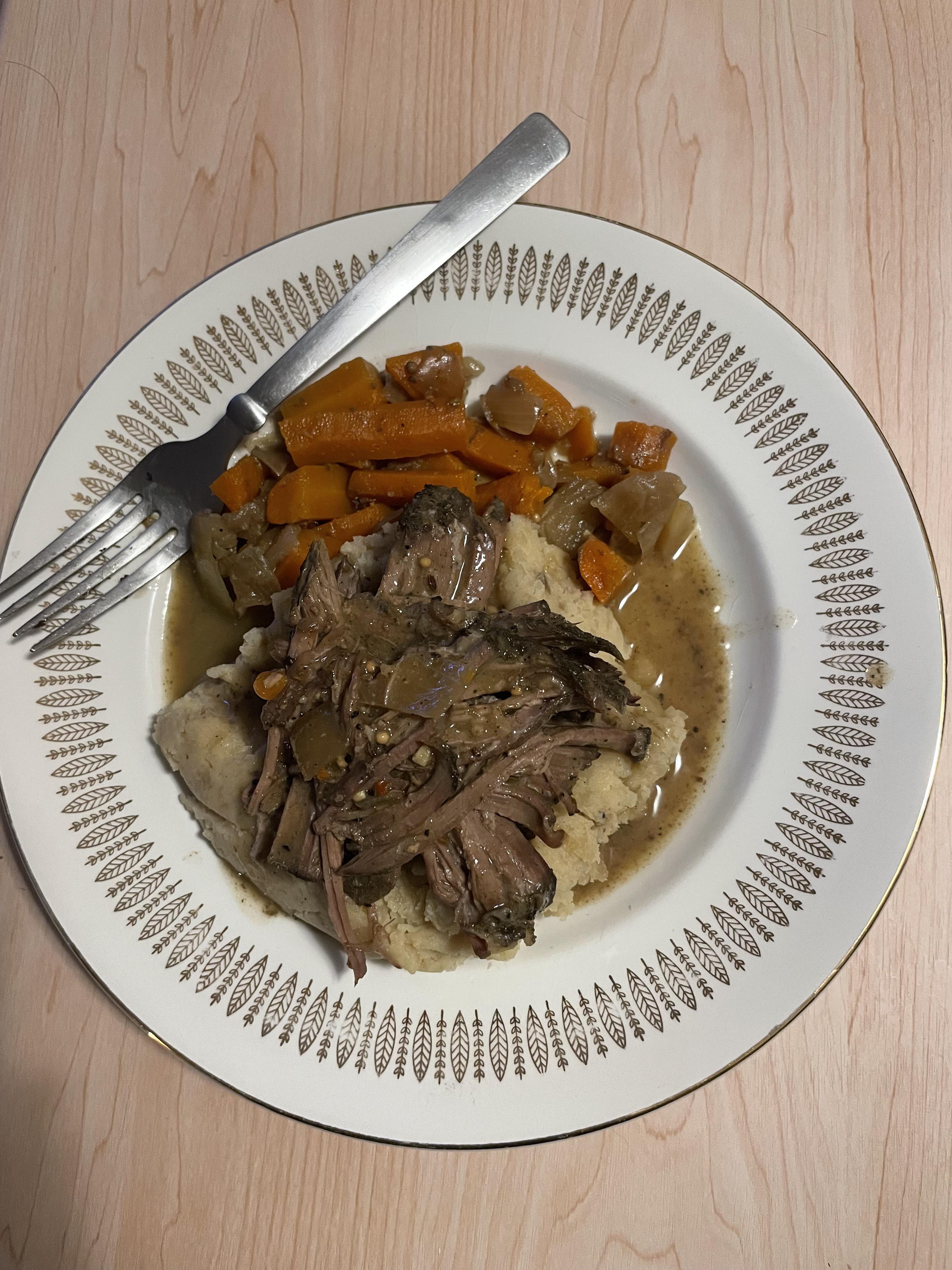 Recipe I used: https://borrowedbites.com/slow-cooker-fall-apart-pot-roast/