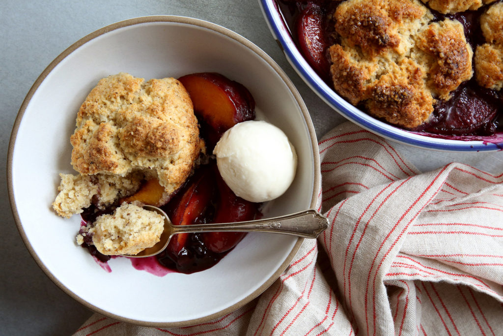 - Bake until fruit is bubbling, topping is golden brown, and a toothpick inserted into the center of one biscuit comes out with moist crumbs attached, 40 to 45 minutes. Serve warm or at room temperature.