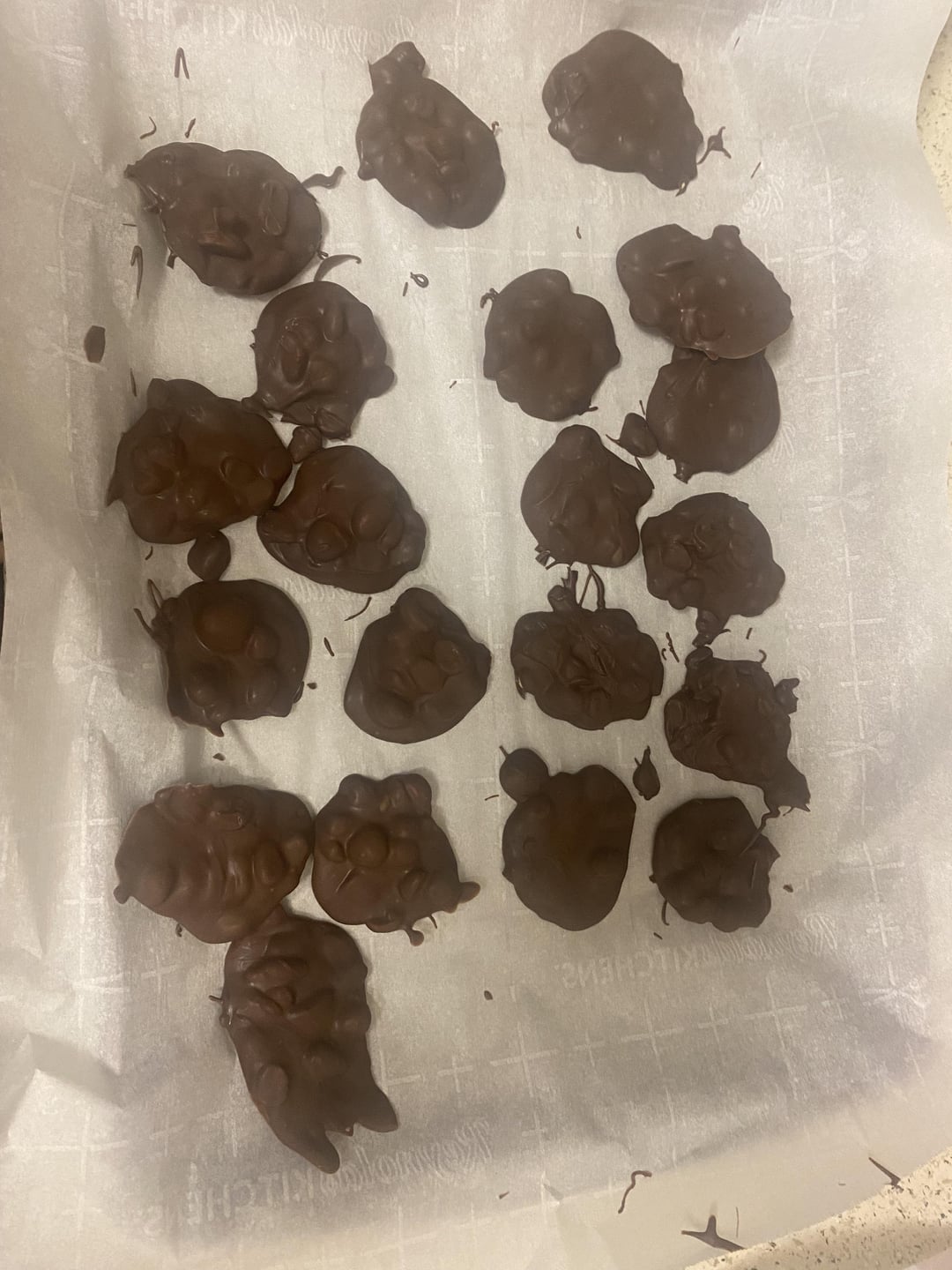 4: Scoop heaping tablespoonfuls of the melted chocolate and nut mixture onto wax paper or parchment paper. (I used a small ice cream scooper)