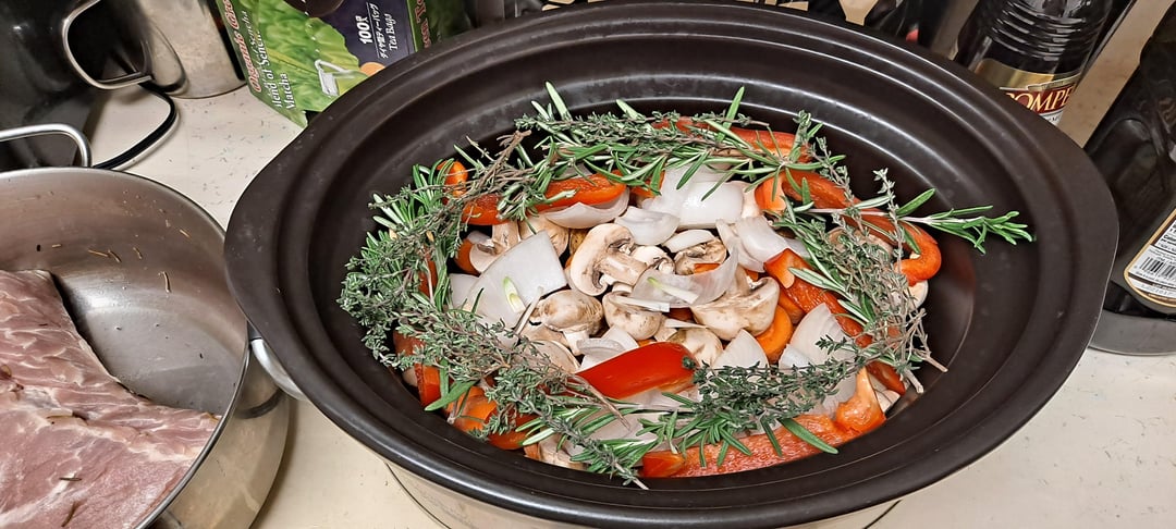Layer potato, carrot, mushroom, white onion and red bell pepper in crock pot. Ring with fresh sprigs of thyme and rosemary.