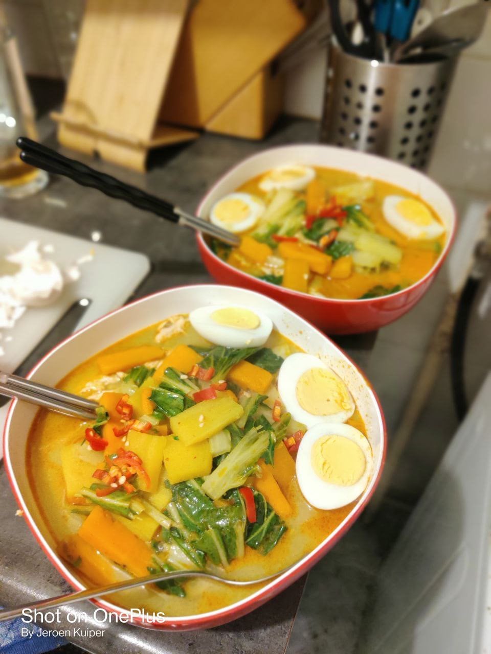 I’m so happy with the result 😊. The sweet potatoes went in with the chicken and the broth, the white stalks of the paksoi I added a half hour before the end and the leaves and bamboo shoots at the end when it simmers on the stove.