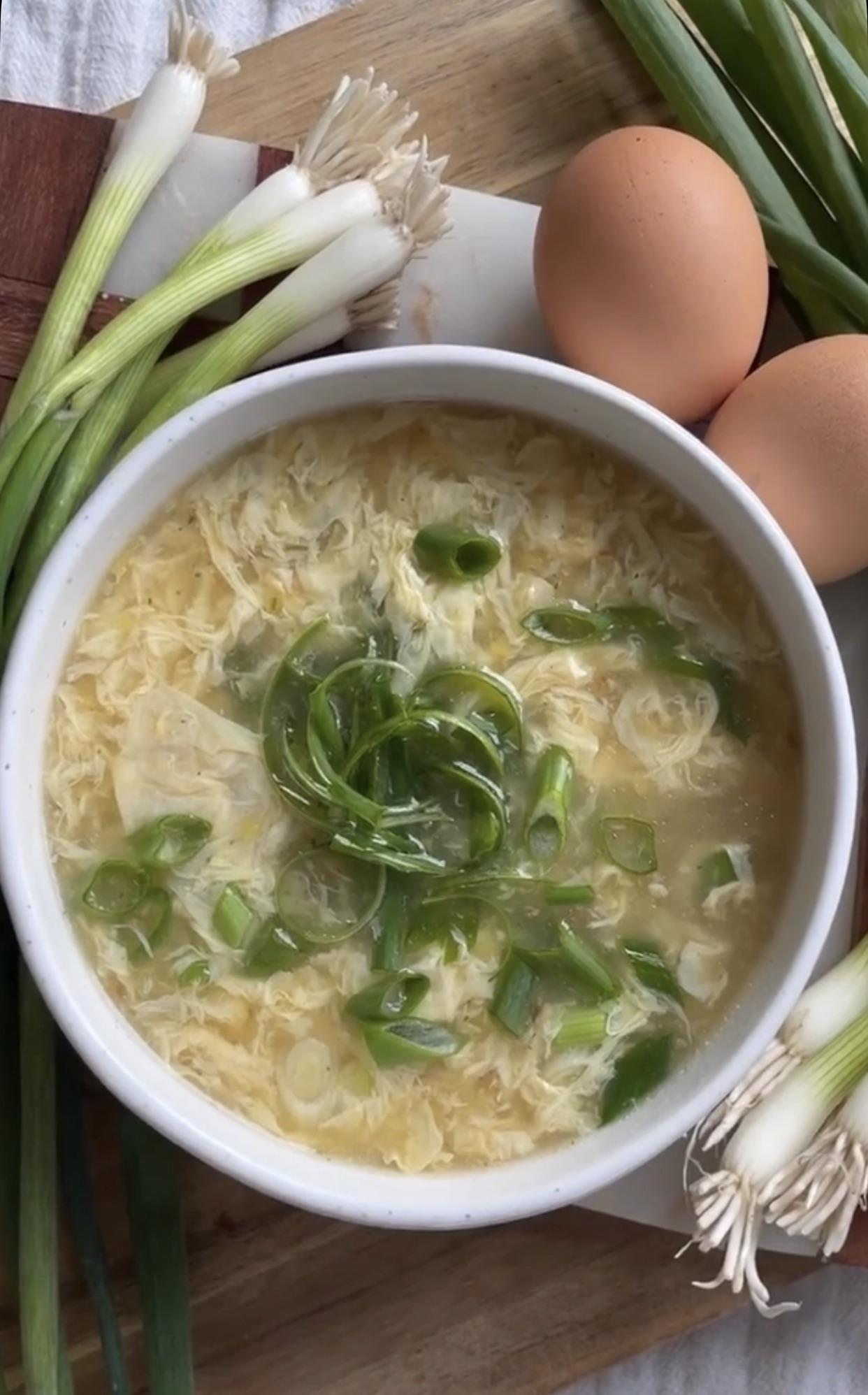 1. In a pot, bring chicken broth to a boil. 2. In a bowl, combine cornstarch and water. Mix well until all cornstarch is dissolved. 3. Add ginger, garlic salt, black pepper and cornstarch mixture to broth. Stir for 1 minute until broth has thickened. Turn heat to medium. 4. Continue slowly stirring in a circular motion while pouring in the egg mixture little by little. 5. Turn the heat off, add sesame oil and garnish with green onions.