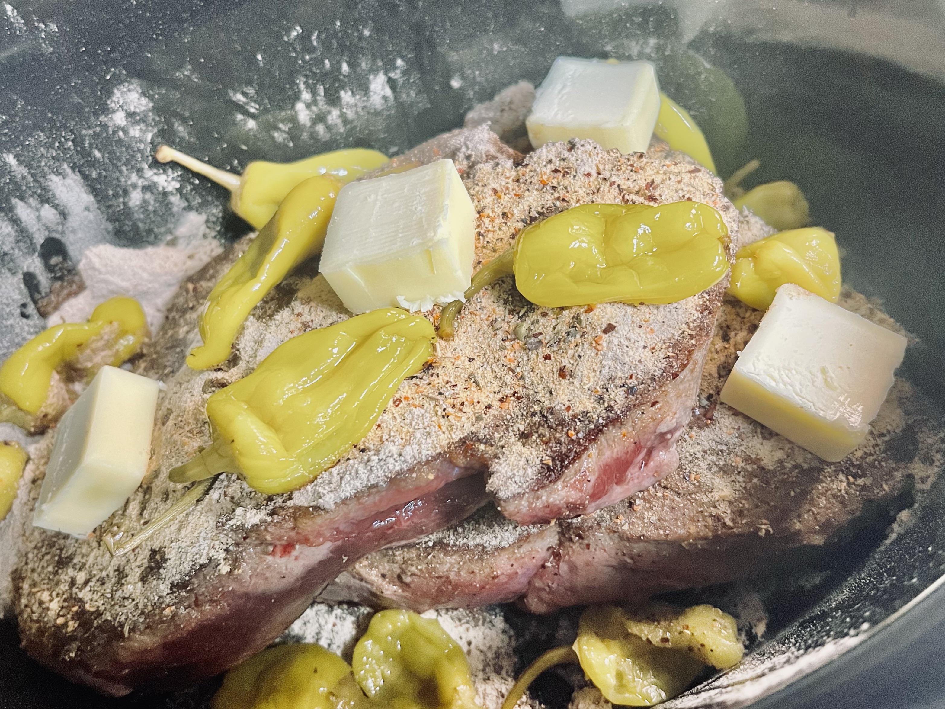 Browned the meat first. Extra peppers. We aren’t ranch people so trying this out with Italian dressing mix instead ¯_(ツ)_/¯