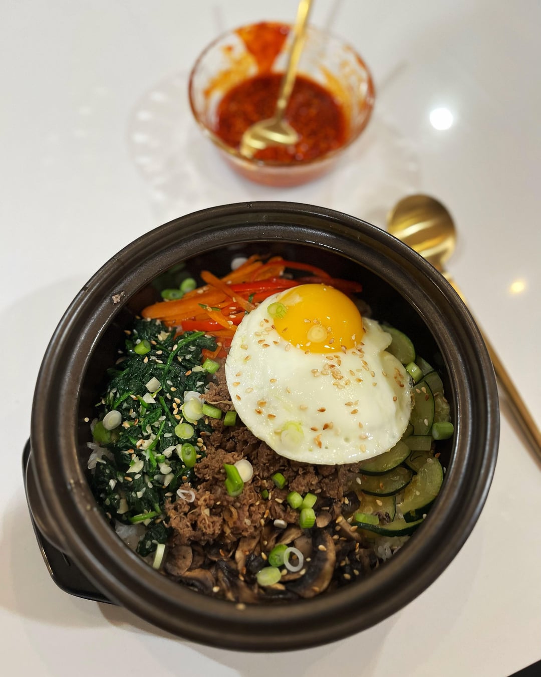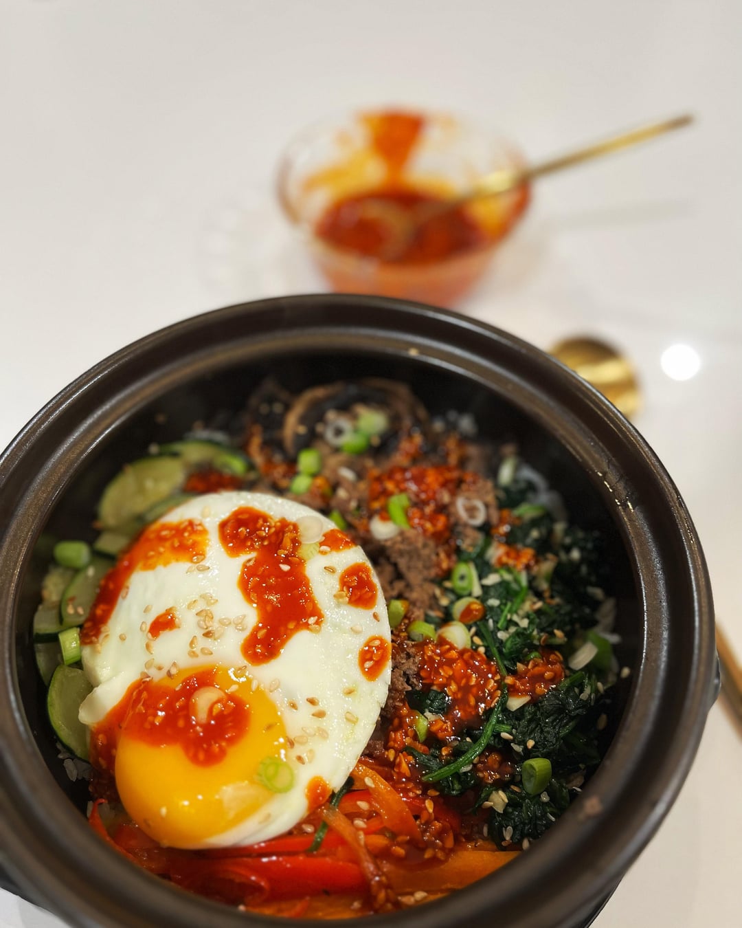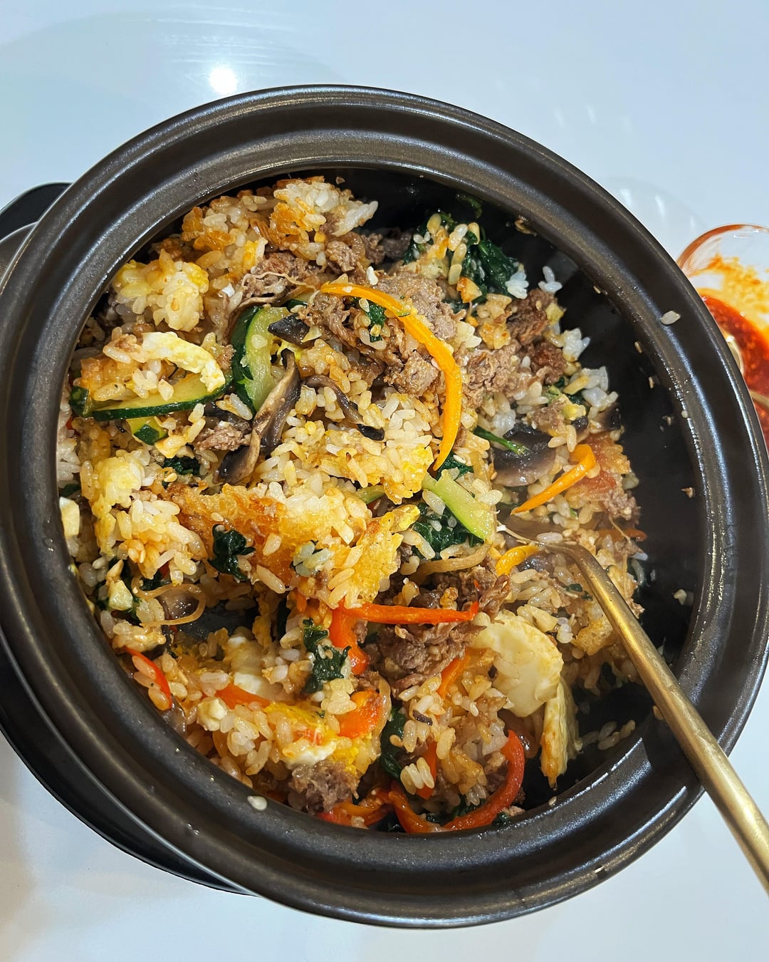 It is my first attempt at making dolsot bibimbap. 🙂 Since I am iced in at my house in Dallas, Texas I thought I’d try using my new stone bowl! 🤍 For my veggies I used zucchini, red & orange bell peppers, and spinach. I am happy with how it turned out.