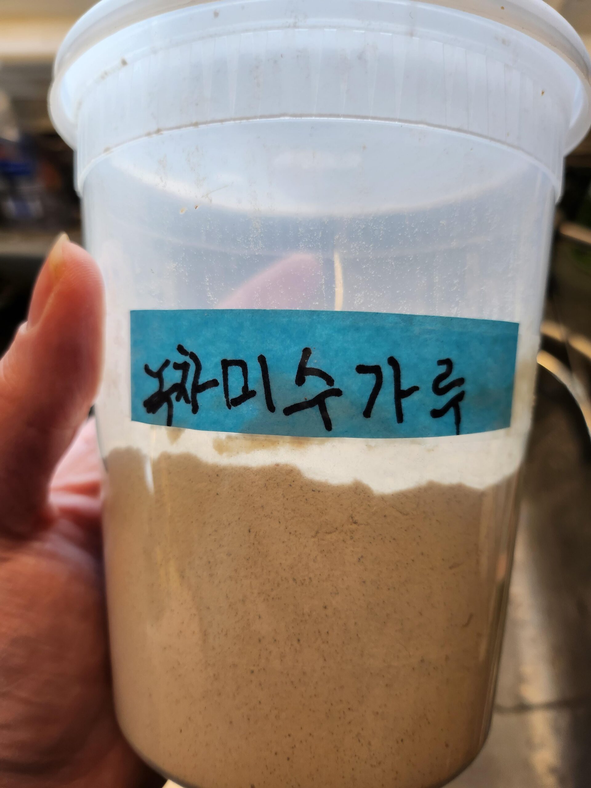 Ok-Cable7970 3 years ago 녹차 미수가루(미숫가루)Green tea misugaru—mixed grain powderAdd to milk or water like protein powder &shake well. Mildly sweet and nutty drink. Kind of thick in texture.