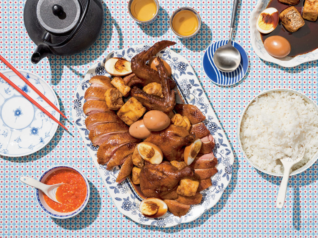 5. Remove the duck to a platter or cutting board, and tent with foil. Let it rest for 10 minutes. Add the tofu and eggs to the sauce, and simmer them gently for 10 minutes, until stained and hot. Skim the sauce of any floating fat if necessary, and serve it all with rice and chile sauce.