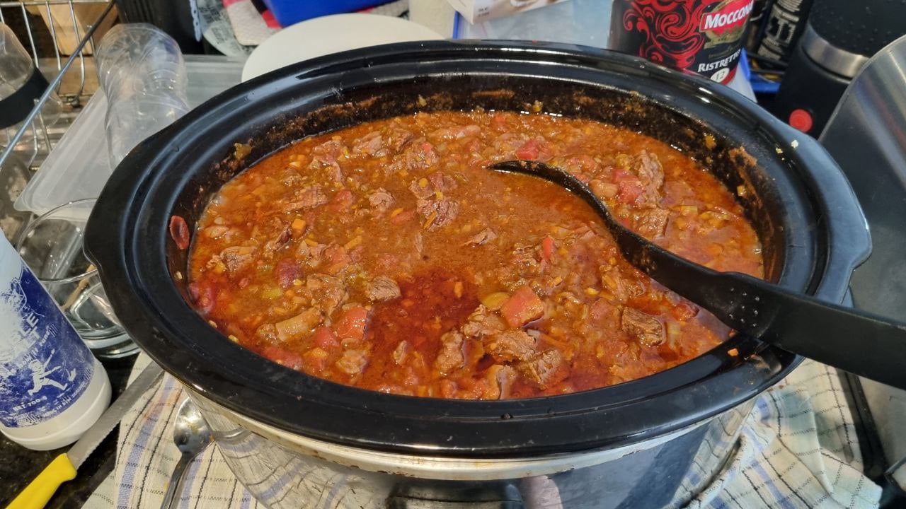 Fry off the onions and capsicum slowly till it is slightly browned and then add tomato paste and fry it off, then add to the crock pot.