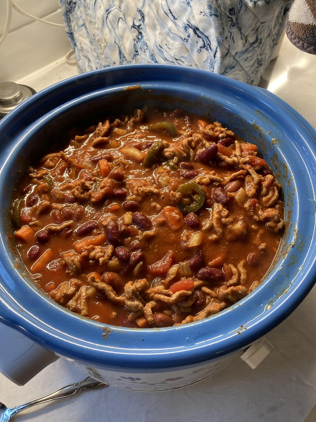 We normally don’t use our slow cooker. I think this may be the only meal we ever make in it. It’s technically a plain old chili that you can modify to your tastes. Originally meant for ground beef but can easily substitute turkey.