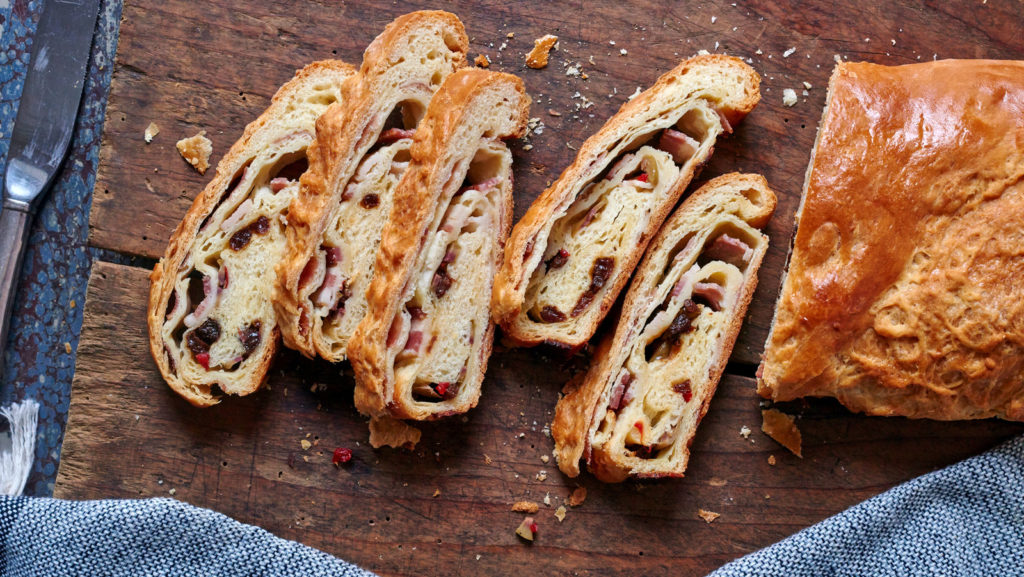 This recipe for the traditional Venezuelan Christmas bread comes from Martha Beltrán in Austin, Tex., who brought the recipe with her when she moved to the United States and now considers it essential to her family’s Thanksgiving feast. Ms. Beltrán always starts the bread the day before she serves it, laminating it with butter three times before rolling it up with ham, bacon, olives and pimentos. The process can be long, but the dough can be left in the fridge for a flexible and forgiving amount of time, even overnight. When the finished loaves are sliced, each piece reveals a festive butter-slicked swirl.