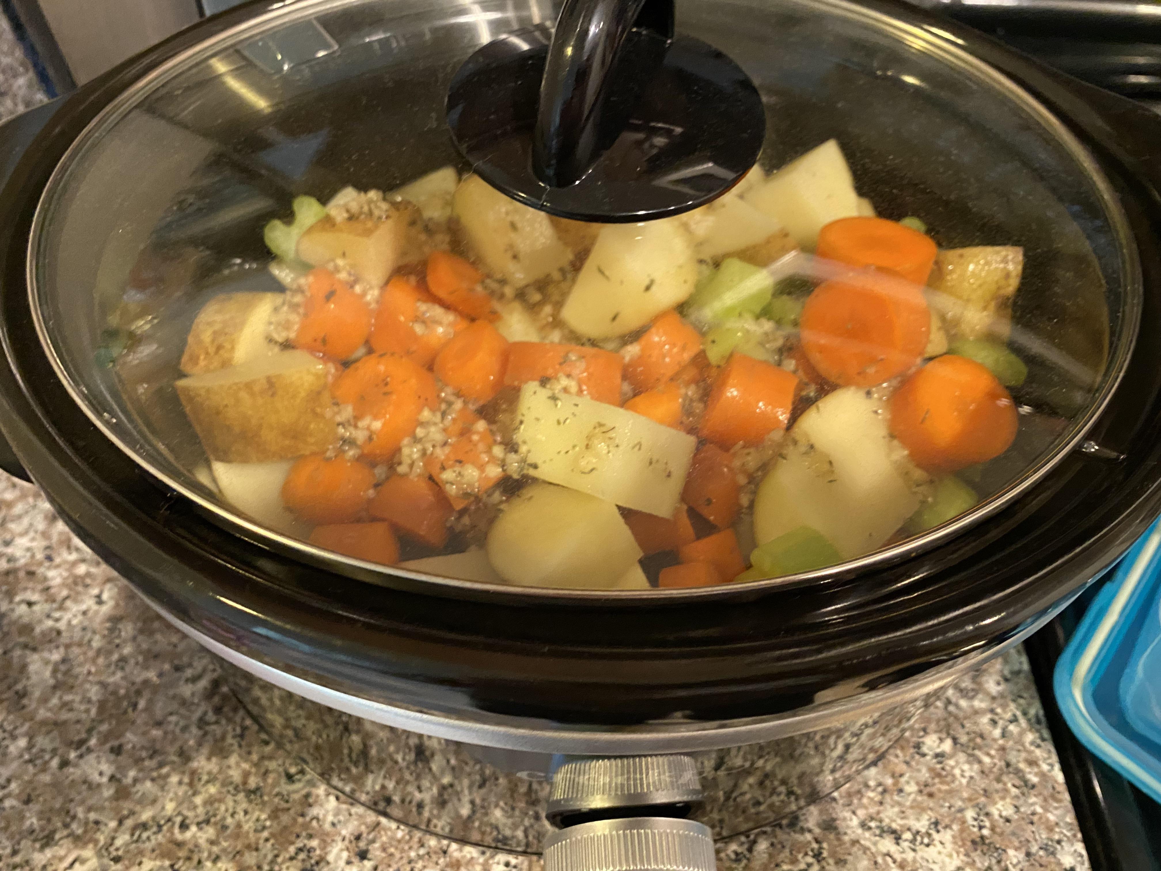 Added chicken to bottom of crock pot, then topped with potatoes, carrots and celery. Melt butter and add garlic, salt, pepper and Italian seasoning. Pour over the top, turn on low for 6-8 hours. I also added a half cup of chicken stock to mine but I think that may be personal preference really. Really looking forward to getting back to some east slow cooked dinners!