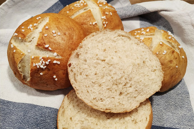 1. Whisk yeast and warm water together. Allow to sit for 1 minute. Meanwhile, melt 1 Tablespoon of butter (reserve the rest for step 6). Whisk in salt, brown sugar, and melted butter. Slowly add 3 cups of flour, 1 cup at a time. Mix until dough is thick. Add 3/4 cup more flour until the dough is no longer sticky. If it is still sticky, add 1/4 – 1/2 cup more, as needed. Poke the dough – if it bounces back, it is ready to knead. 2. Turn the dough out onto a floured surface. Knead the dough for 3 minutes and shape into a ball. Place in a large greased bowl, cover tightly with plastic wrap, and allow to rise in a warm environment for 1 hour or until nearly doubled in size. 3. Once risen, punch dough down to release any air bubbles. Turn out onto a lightly floured surface and, with a sharp knife or pizza cutter, cut dough into 1/3 cup sections. You should have about 12. Shape into balls. 4. Preheat oven to 400°F (204°C). Line 2 baking sheets with parchment paper or silicone baking mats or line a 9×13 baking pan. Set aside. 5. Bring baking soda and 9 cups of water to a boil in a large pot. Drop 1-2 pretzel rolls into the boiling water for 20-30 seconds. Using a slotted spatula, lift the pretzel roll out of the water and allow as much of the excess water to drip off. Place pretzel rolls onto prepared baking sheet or close together in the baking pan. Using a sharp knife, score a couple slits into the top of each. 6. Melt the remaining butter. Lightly brush each roll with melted butter and sprinkle with coarse sea salt. 7. Bake for 22-26 minutes or until a deep golden brown on all sides.
