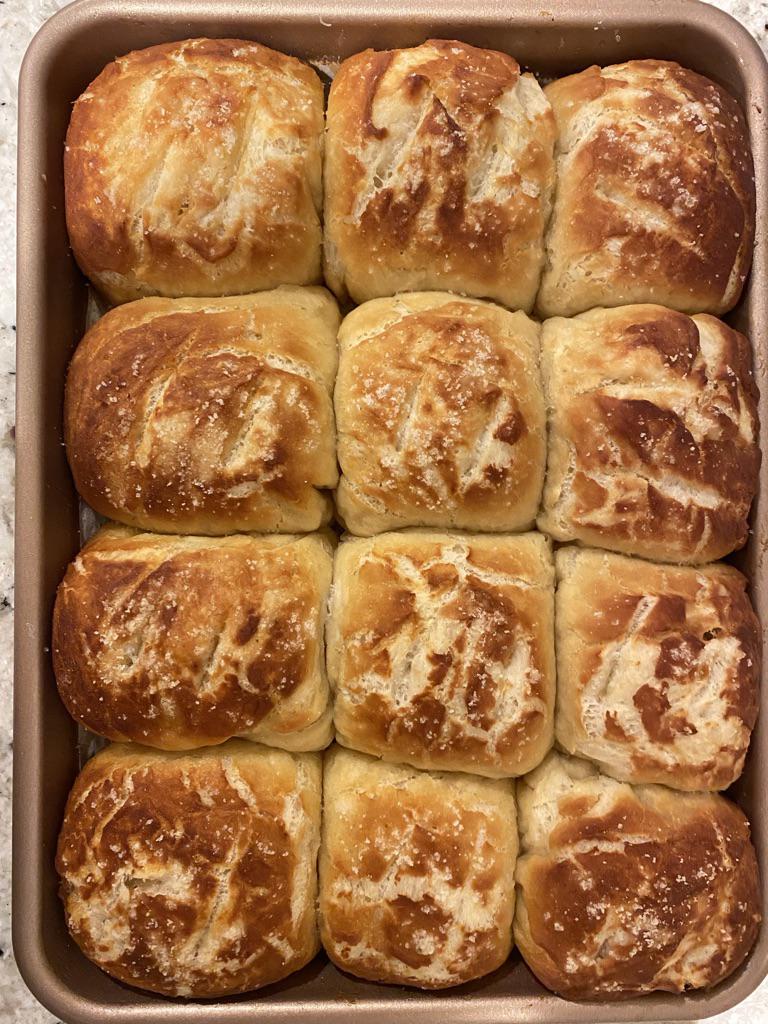 Don’t put them in a baking pan, they need a bit of room to spread and rise during baking so they become fluffy, instead of thick lumps of dense bread. And for the love of the gods, the slits in the top are meant to be an X so the bread can rise up and open the top. The buns shouldn’t look like they got attacked by a methhead with a hatchet.