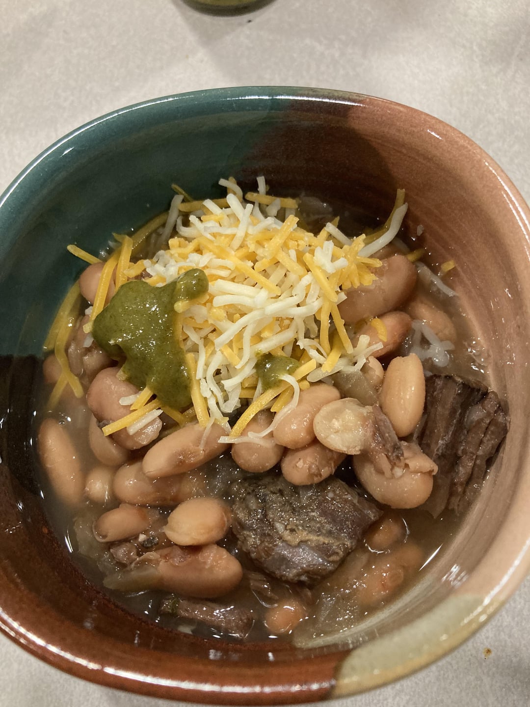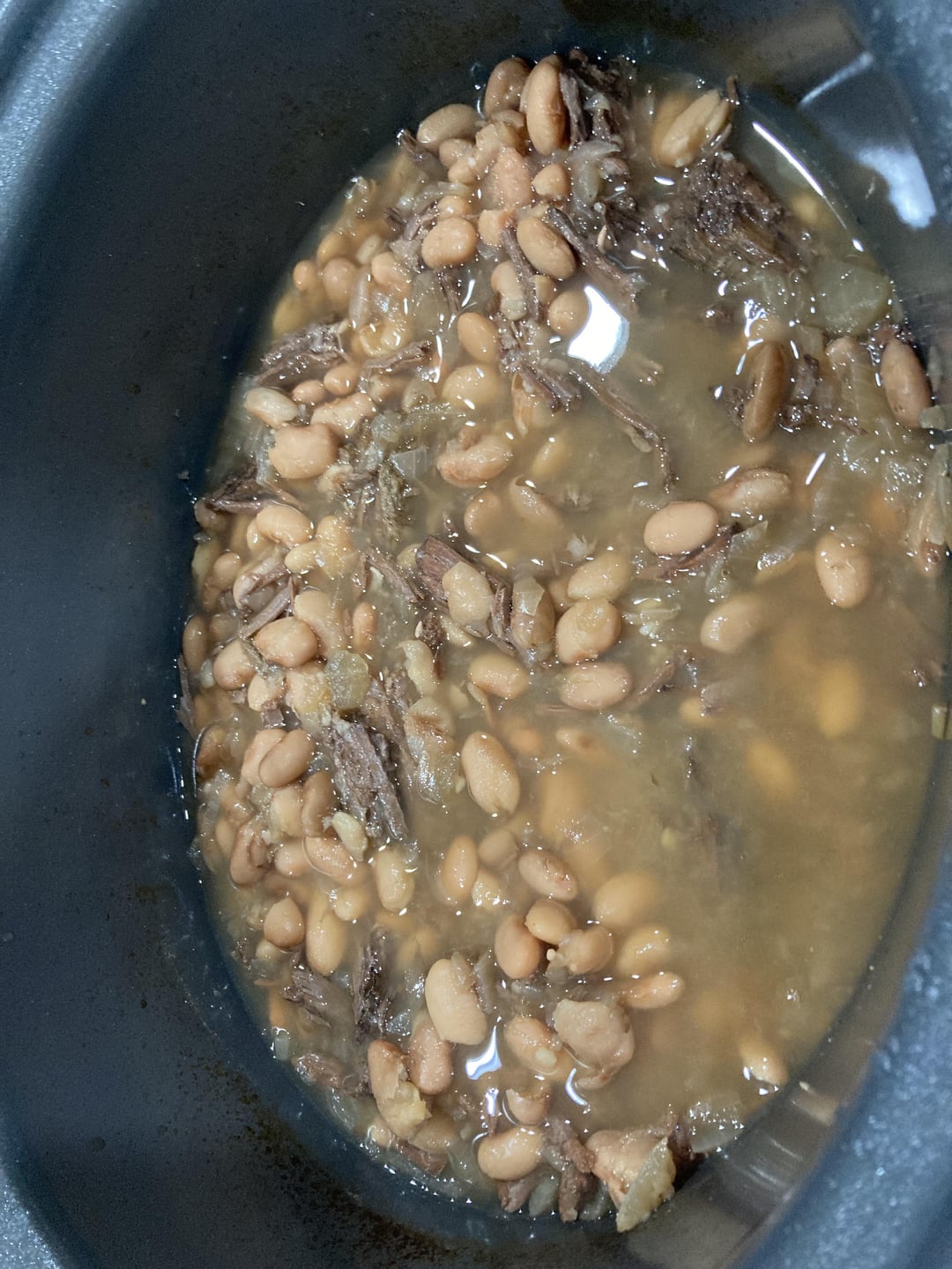 vyrtgo 3 years ago Recipe:~1/2 lb-ish of leftover Mississippi pot roast (or more)-1 yellow onion diced-1 lb pinto beans-32oz of beef broth-32oz waterCook low 8 hoursServe with favorite garnishes