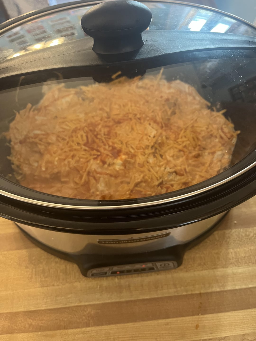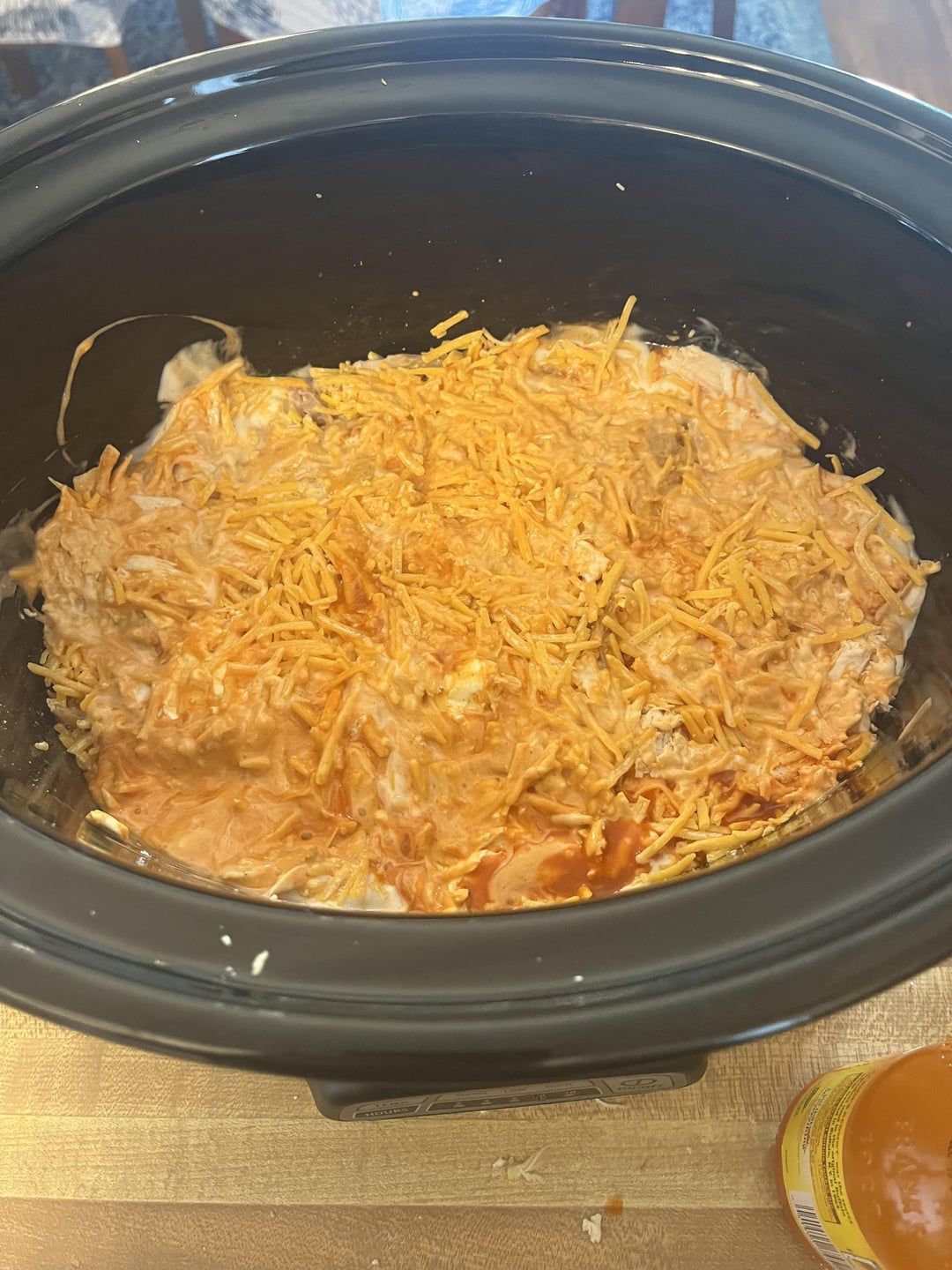 3. Add chicken, cheese, sauce and ranch- make sure to pack between the cubes and then cover. Top with additional cheese and hot sauce. Stir gently