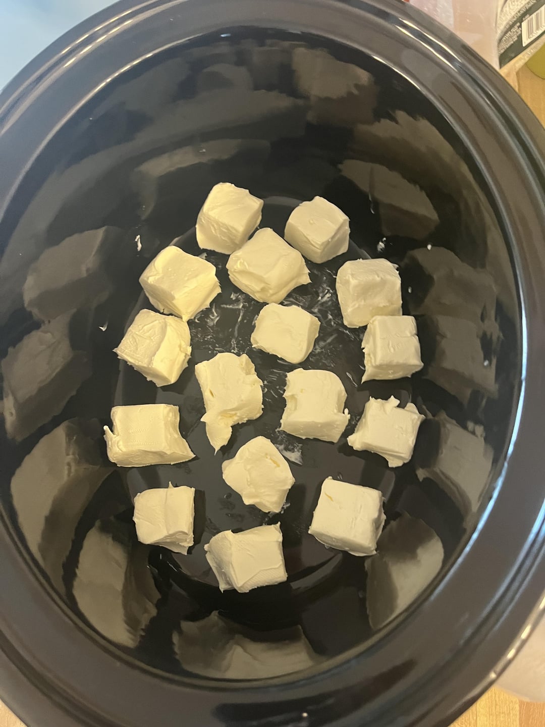 1. In a large bowl, shred the rotisserie chicken to yield about 4 cups. Make sure to avoid any small bones. 2. Cube cream cheese and lay in bottom of crockpot. 3. Add chicken, cheese, sauce and ranch- make sure to pack between the cubes and then cover. Top with additional cheese and hot sauce. Stir gently 4. Cook on HIGH for 2 hours. Serve with chips, garnish with bleu cheese if desired.