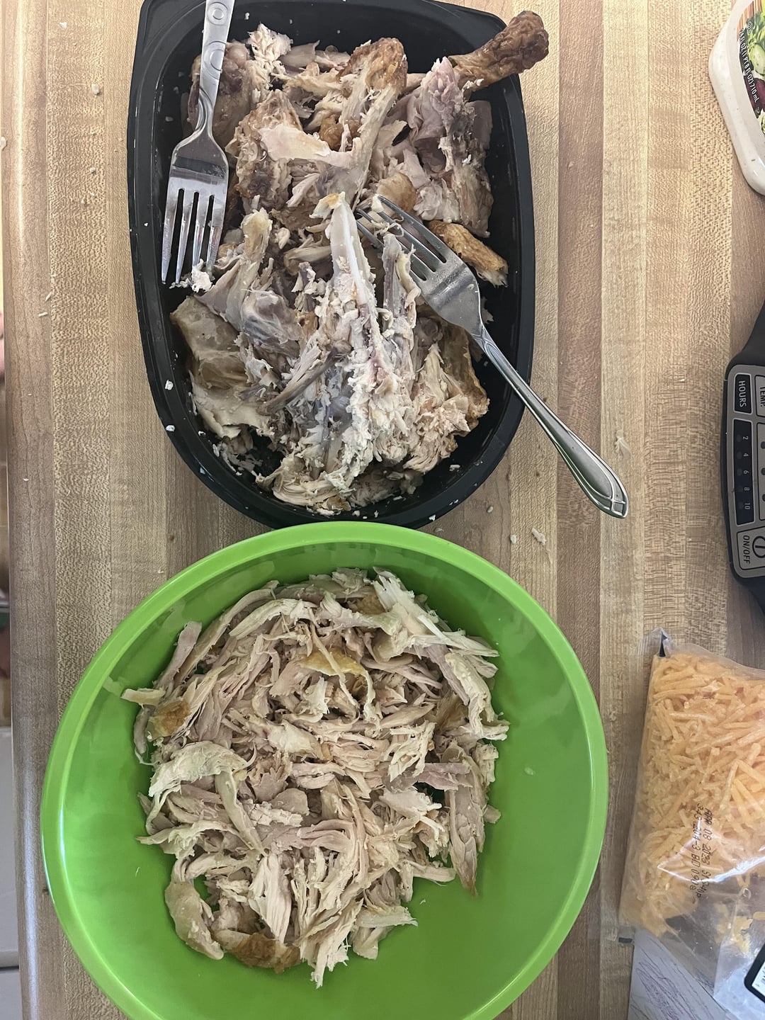 1. In a large bowl, shred the rotisserie chicken to yield about 4 cups. Make sure to avoid any small bones.