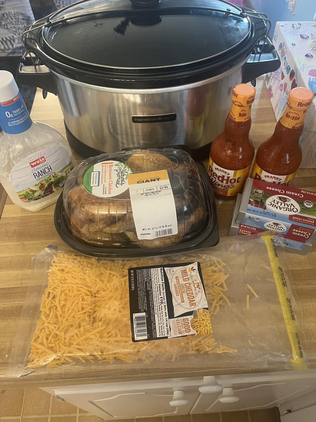 1 rotisserie chicken (or 2-20oz cans chicken), 2-8oz bricks cream cheese, 2 cups cheddar cheese, 1 cup ranch dressing, 1-12oz bottle hot sauce. Optional bleu cheese crumbles or scallions for garnish