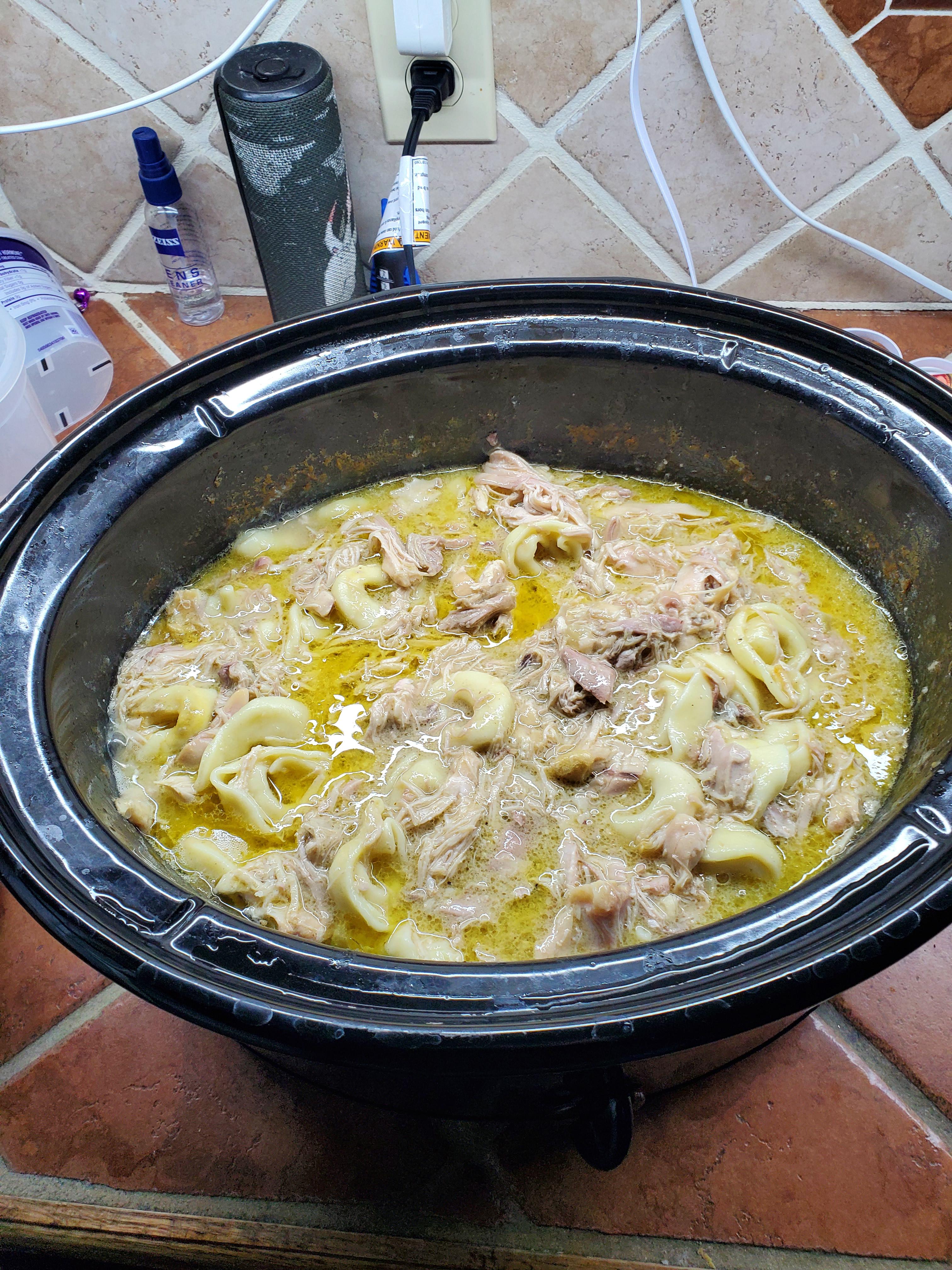 rupert240 3 years ago I cannot find the original recipe I based this on, but here is essentially what I did for this batch6 chicken thighs 2 cans of cream of chicken soup 4 cups chicken broth 1 stick butter Salt, pepper, garlicCook on low for 4 hoursShred and debone chickenAdd noodles (tortellini in this case) and cook another 30-45 minutes