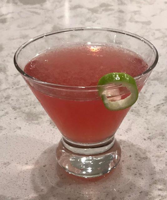 2. Shake cocktail until very cold (10-15 seconds) 3. Strain drink using cocktail shaker (liquid only – no ice cubes – classic martini style) into frozen martini glass 4. Garnish with thin sliced lime peel (place on end of drink – see picture)