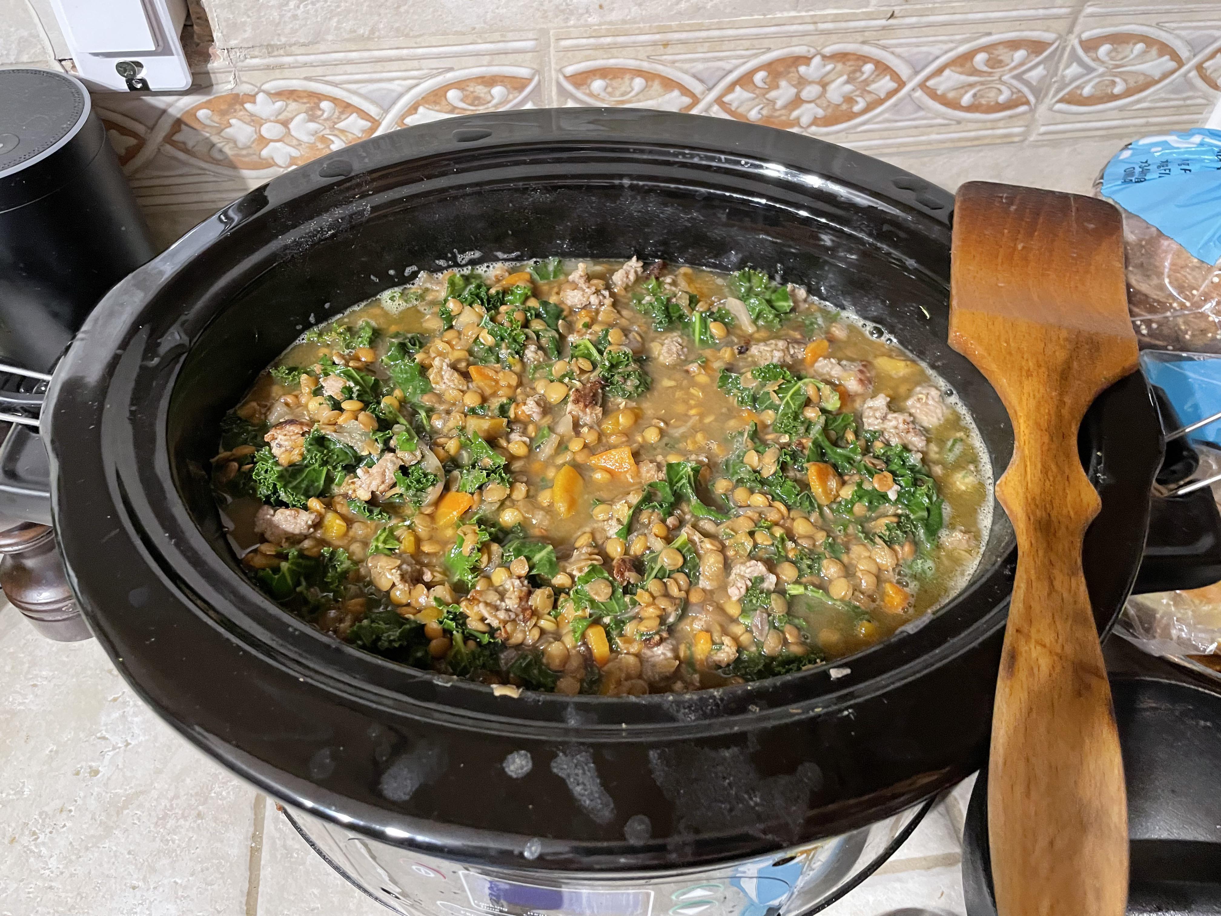 Add lentils, bay leaves, sage, better than bouillon, and cooked sausage to slow cooker. Add enough water to cover all ingredients plus about 1.5 inches.