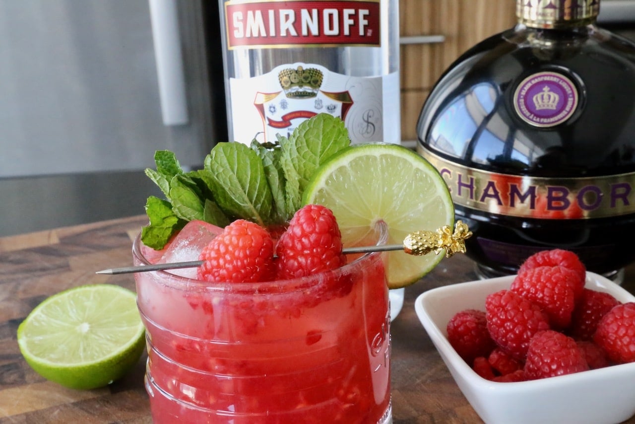You can make the recipe [HERE](https://dobbernationloves.com/food-drink/raspberry-moscow-mule-cocktail-drink-recipe/). Ingredients • 2 oz Vodka • 0.5 oz Chambord Raspberry Liqueur • 0.5 oz Lime Juice • 1/4 cup Fresh Raspberries • 4 oz Ginger Beer • Fresh Mint Sprig garnish • Lime Wheel garnish Instructions 1. Muddle lime juice and raspberries in a copper mug or cocktail glass with ice. 2. Add vodka and Chambord then top with ginger beer. 3. Garnish with a lime wheel and mint sprig.