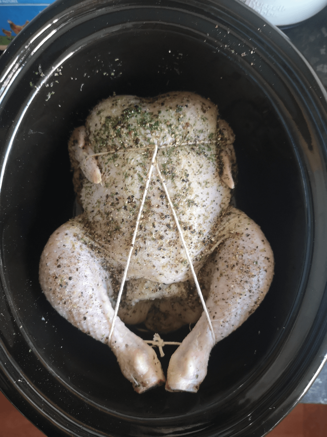 Whole medium chicken trussed up a little so it doesn’t touch the sides. Seasoned with salt, pepper and thyme with nothing else added. No pics after, it was too good and very tender.
