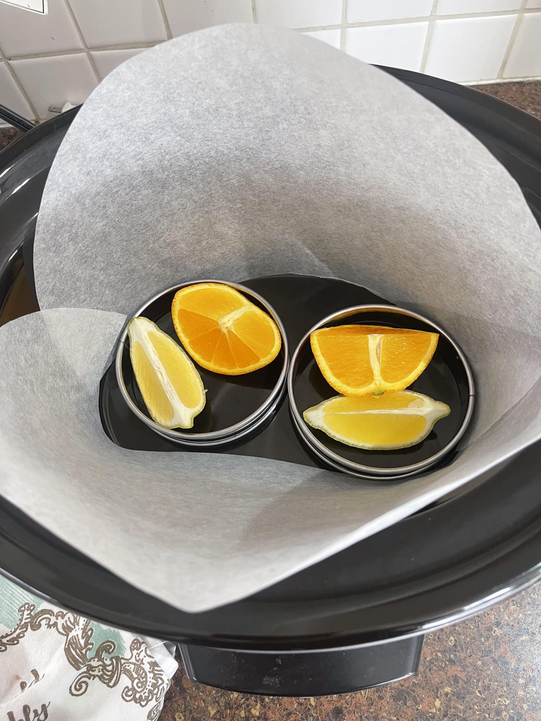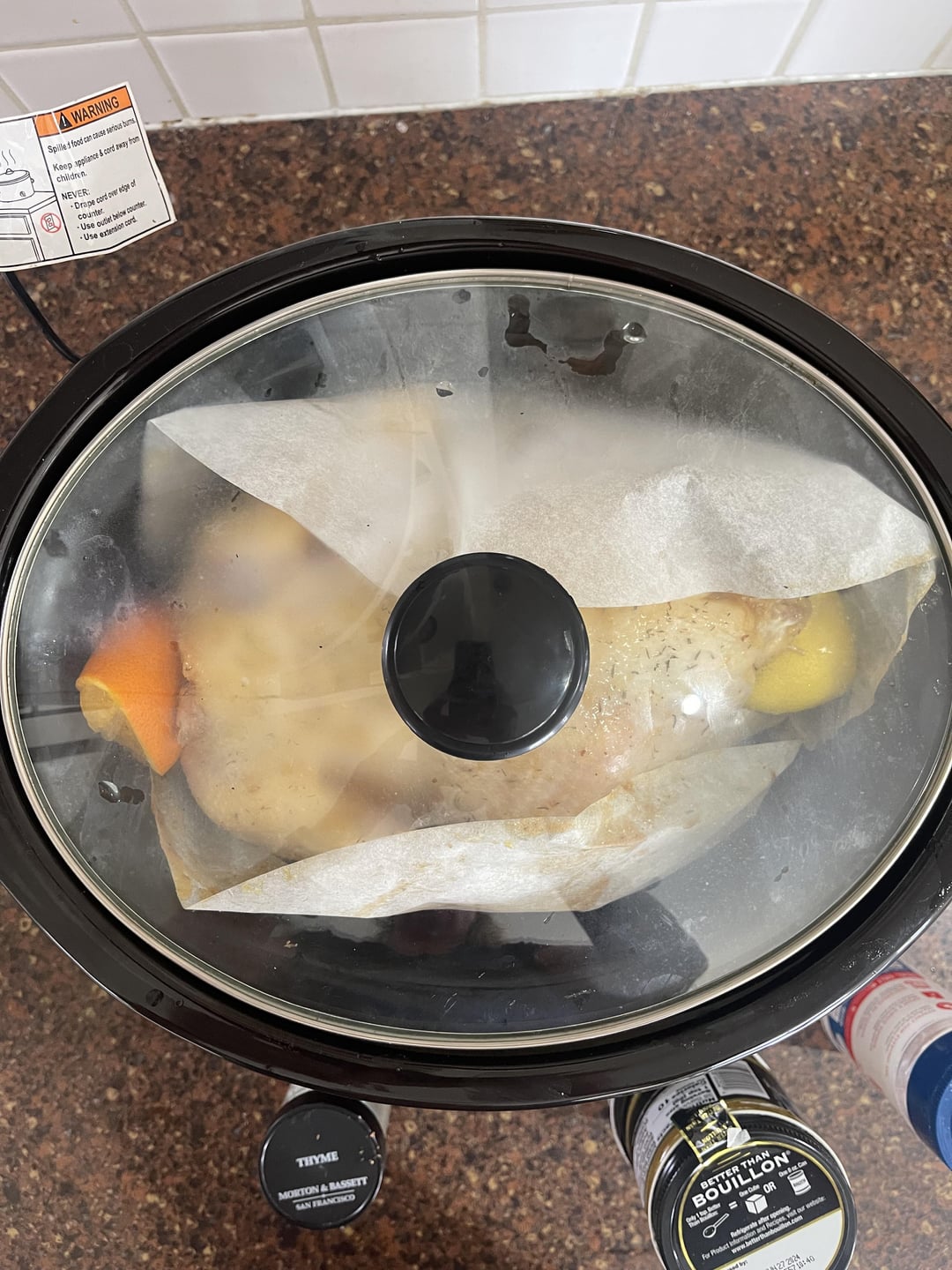 I browned the bottom in heavy skillet with a little olive oil spray. Tried to keep chicken from touching sides by using some rings and parchment. We love lemon chicken so I used citrus on hand and then rubbed with a mixture of Better than Bouillon chicken and roasted garlic. Sprinkled with salt and thyme. High for 4 hours. Then broiled just a few minutes for some color. This is cooling then to fridge for supper and lunches this week – probably serve with jasmine rice, sautéed sugar snap peas/red bell pepper strips and pan sauce. (I had to sample a wing) Cheers everyone!