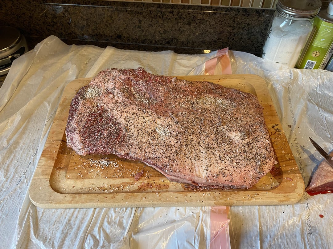 2. I did not use any Prague powder / curing salt for a “smoke ring”. Heard one too many reports of it giving a distinct corned beef taste to the meat (which I am a huge fan of, just not what I wanted to achieve for this cook). That slight smoke ring still developed even though the meat was already “cooked” before hitting the pellet smoker. Not impressive by any means, but I’ll chalk it up to a proof of concept that the meat doesn’t need to be smoked while raw to get a smoke ring.
