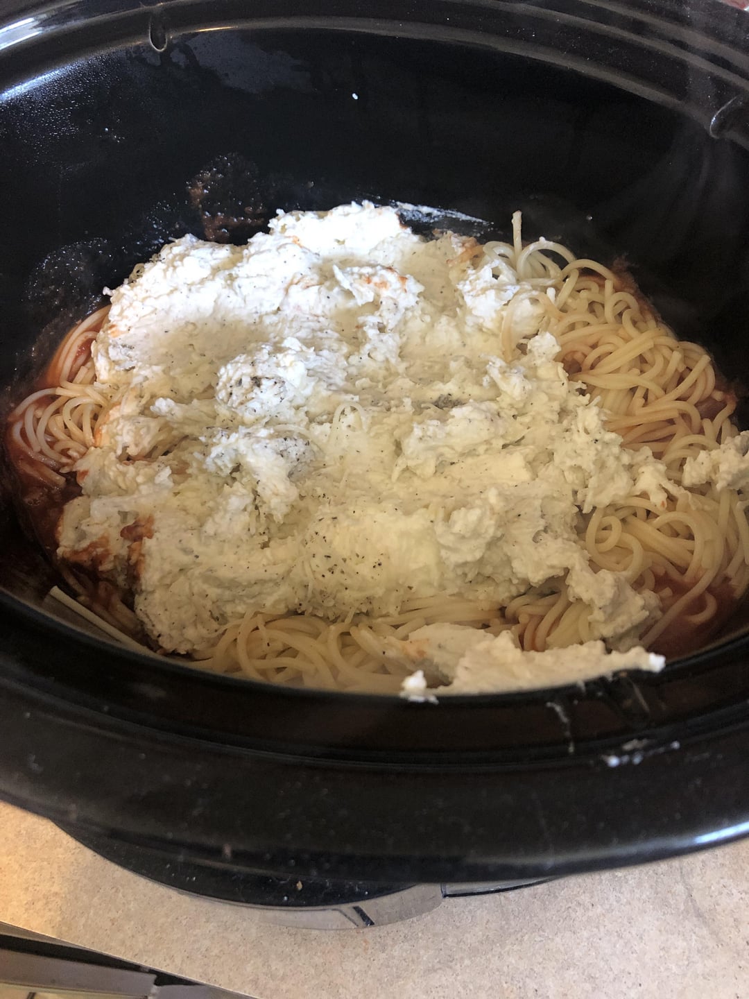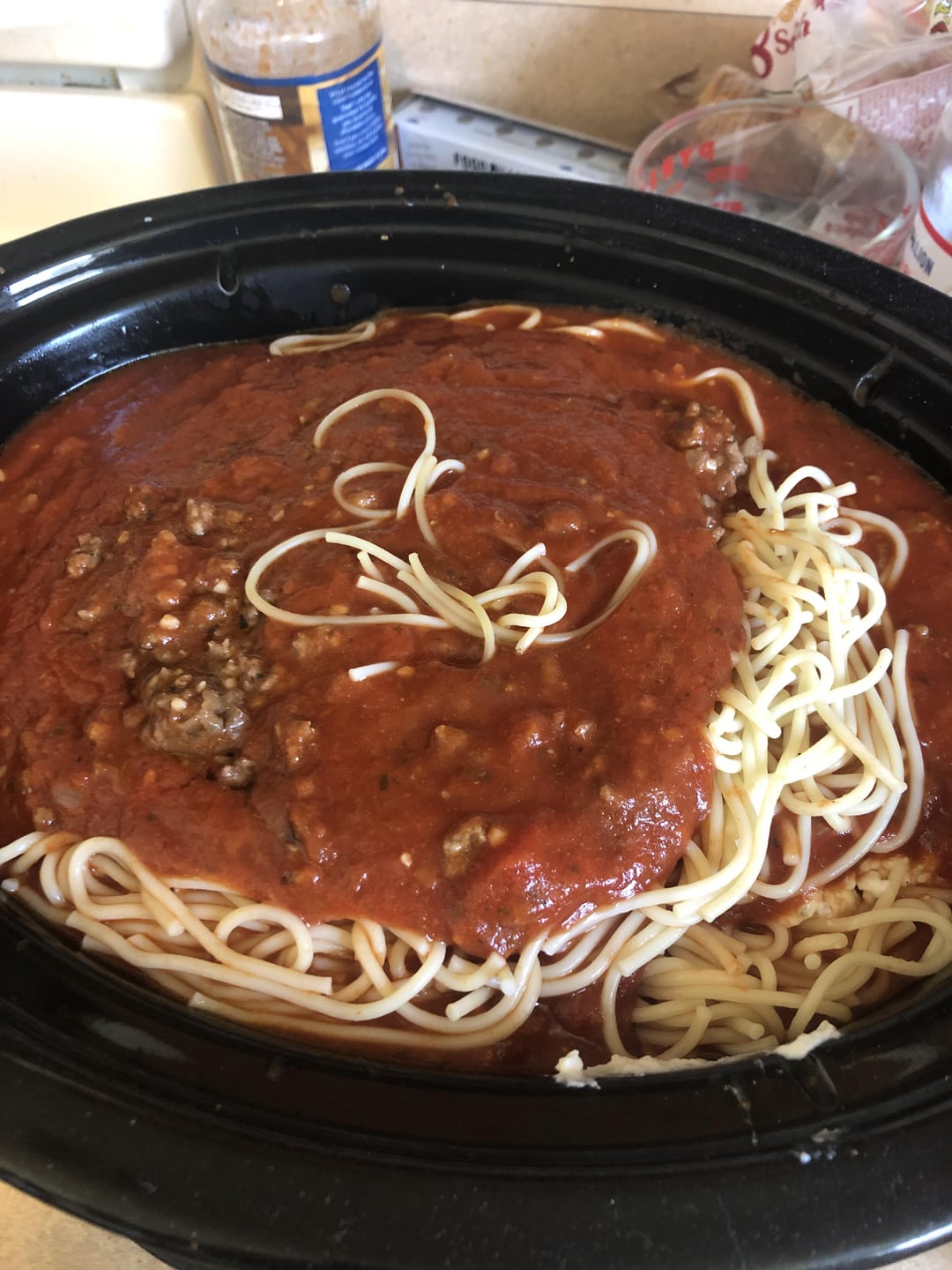 So I’m making spaghetti in a crockpot today. Fried buger cocked spaghetti. Salt pepper onion powder garlic Italian seasoning. Laying in pot sauce ,cheese, pasta.