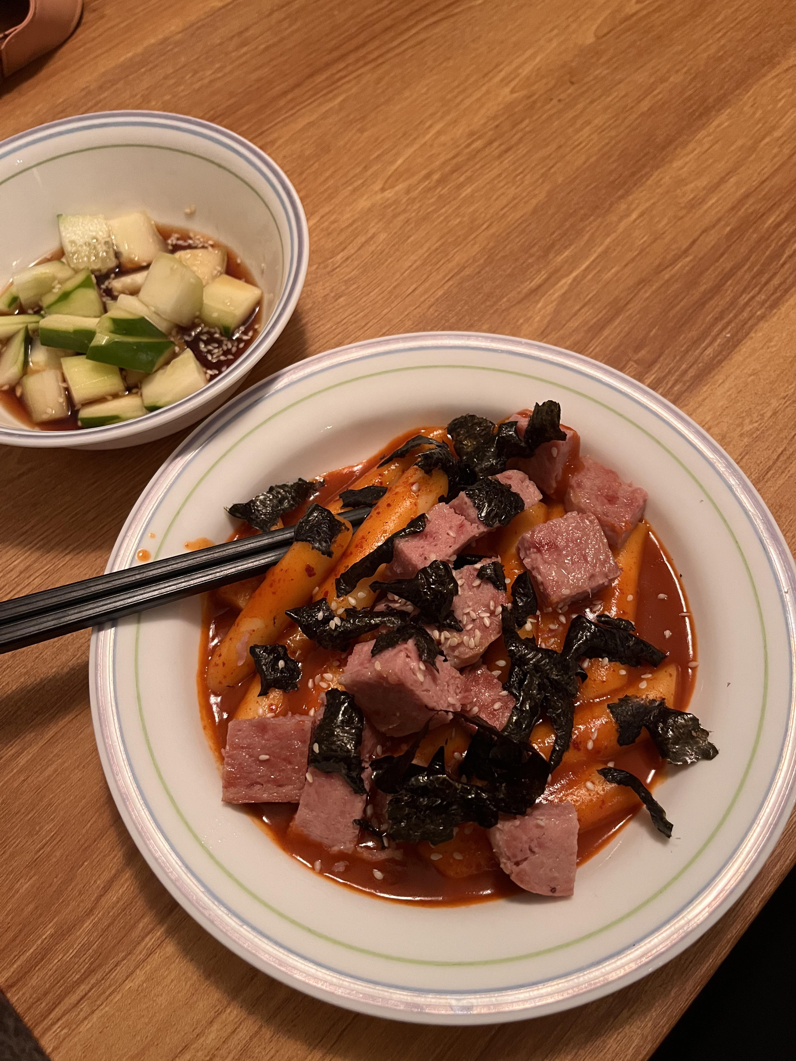 Hahaha! I’m glad I’ve just seen this. The last couple days I’ve been so lazy and didn’t know what to eat so just had cup tteokpokki with grilled bacongrill (similar to spam) in it 😂 I thought I was probably a weirdo but it was so nice. Glad I’m not the only one 😂