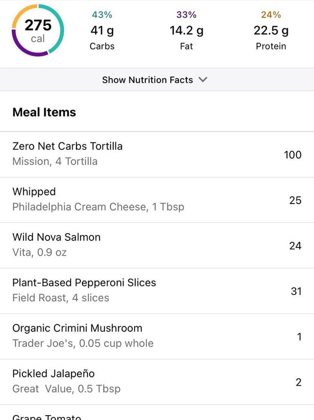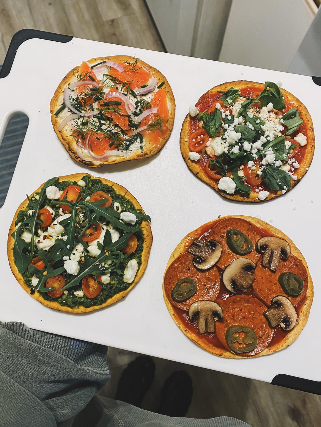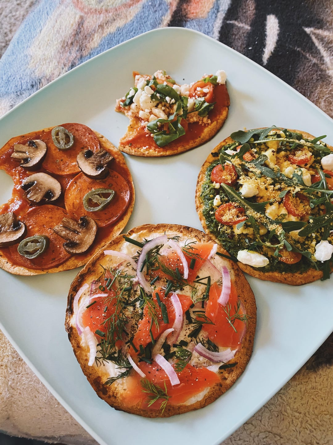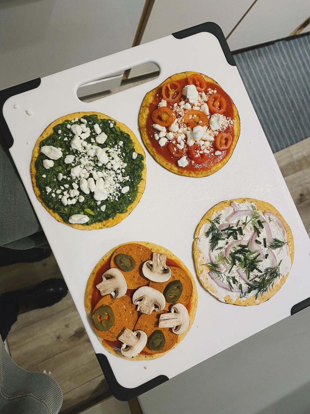 261989 3 years ago 1 crimini mushroom, meatless pepperoni and pickled jalapeño with red sauce2 smoked salmon with dill, chives, and red onion with whipped cream cheese and black pepper3 arugula-basil “pesto” topped with grape tomato, goat cheese, fresh baby arugula and nutritional yeast4 crumbled goat cheese, sliced grape tomato, fresh basil and red pepper flakes on red sauce(all on 25 calorie Mission Zero Net Carbs Sundried Tomato Basil Tortillas)