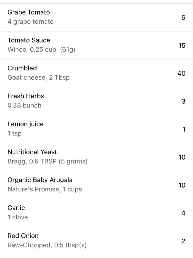 3 arugula-basil “pesto” topped with grape tomato, goat cheese, fresh baby arugula and nutritional yeast