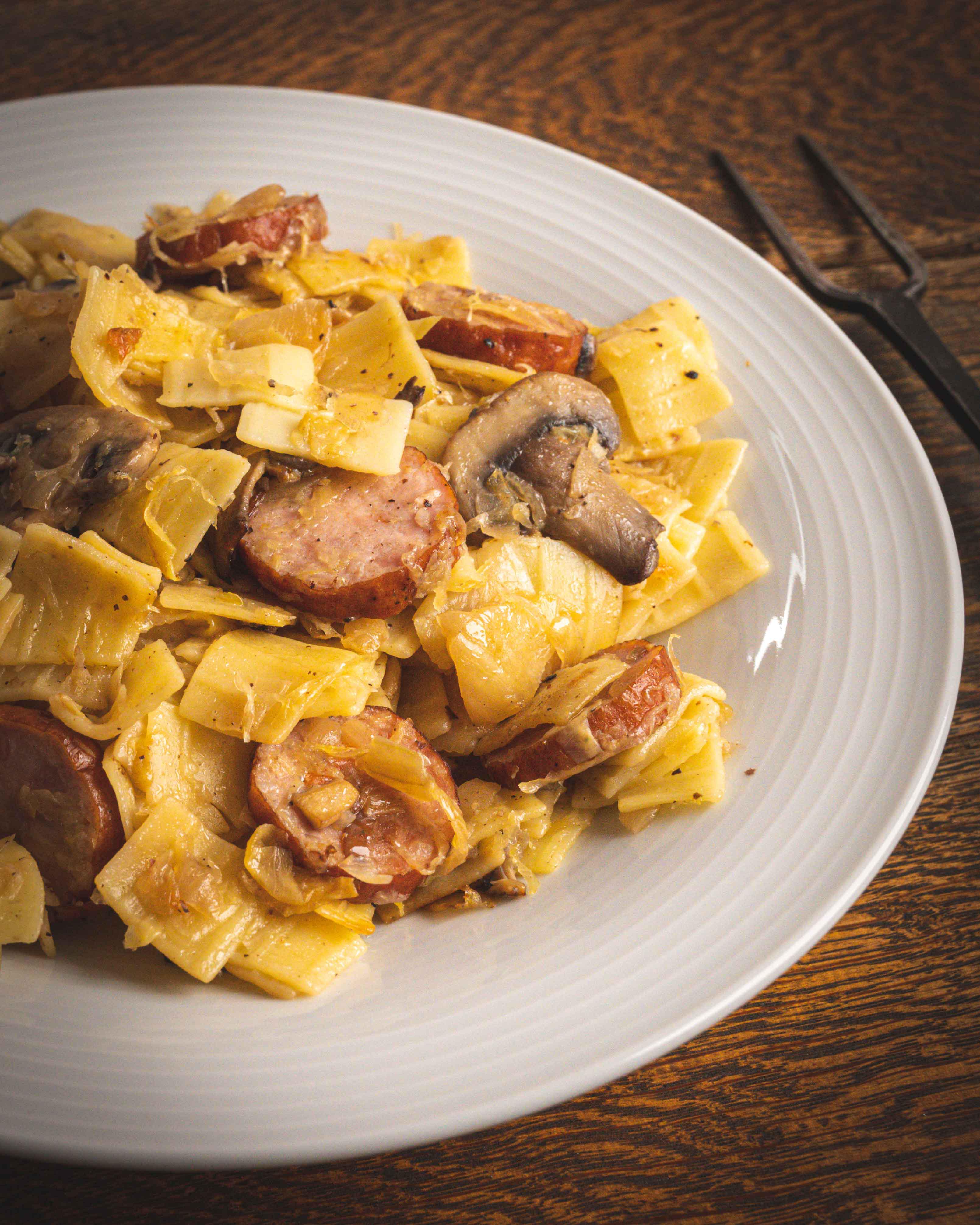 1. You can use any type of pasta you like, but square-shaped pasta works best for this dish. 2. You can add wild mushrooms like porcini or boletus. 3. Make sure to drain the sauerkraut well after cooking it to prevent the dish from becoming too watery. 4. You can use any type of smoked sausage, such as kielbasa, for this recipe. If you prefer, you can also use another type of sausage or omit it altogether for a vegetarian version. 5. Don’t overcrowd the pan when cooking the vegetables, as this can cause them to become soggy instead of getting nicely caramelized. 6. You can adjust the amount of oil you use in the recipe to your liking. You can also substitute the vegetable oil with another type of oil, such as olive oil. 7. This dish can be served hot or cold, so it’s a great option for leftovers or meal prep. 8. You can top the dish with or chopped fresh herbs like parsley or dill for added flavour and texture.