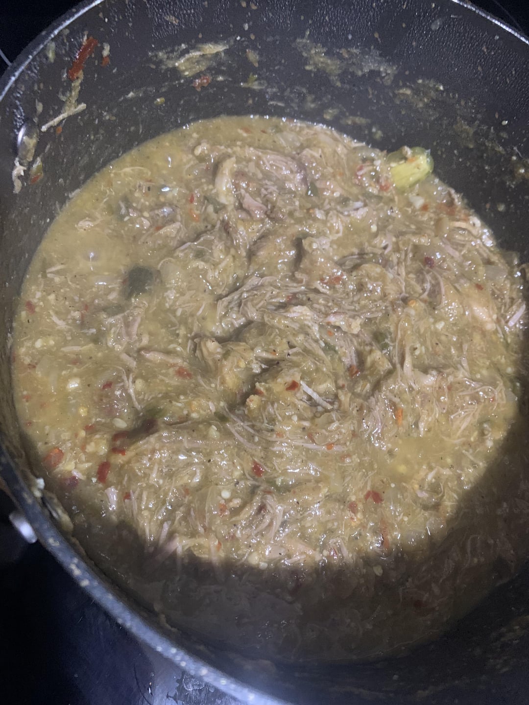 After ten hours of slow cooking, the shoulder just falls apart, I removed some of the fat and added the pork to the Chile. Dropped in two bay leaves. Simmered another 2-3 hours on low heat.