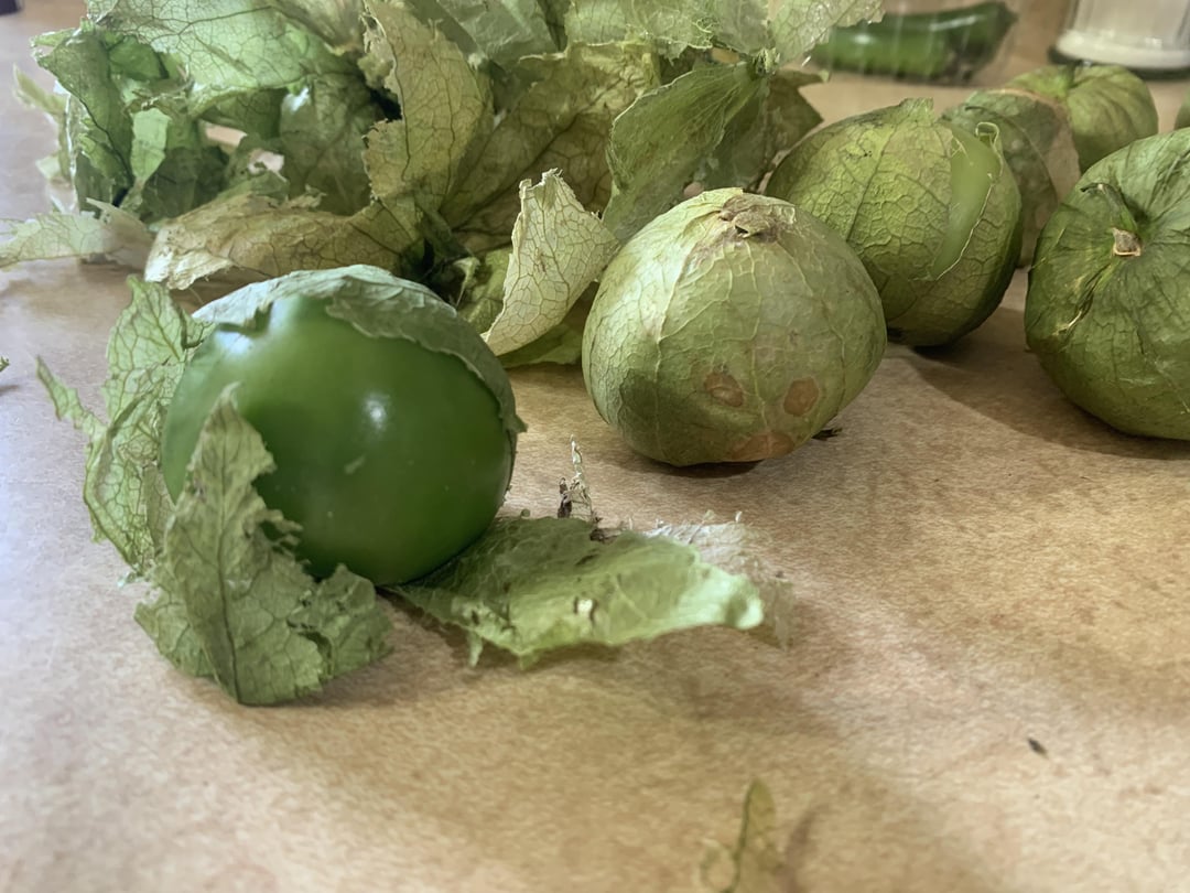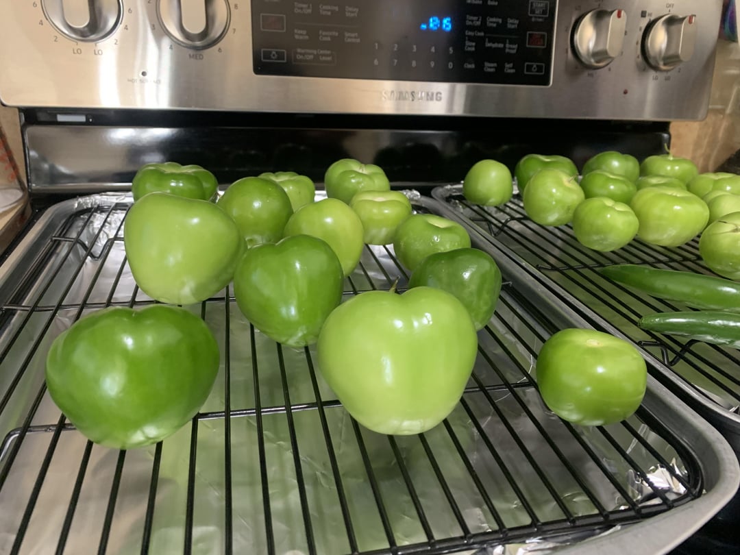I peeled and washed 3 lbs of green tomatillos, and “fire roasted” them in my convection oven (I cheated abuelita I’m sorry I don’t have a gas stove) along with four fresh jalapeños, four Serrano chiles, 1.5 white onions, and two garlic heads with the tops cut off. Wrapped in plastic for ten minutes then peeled and blended, all of it.