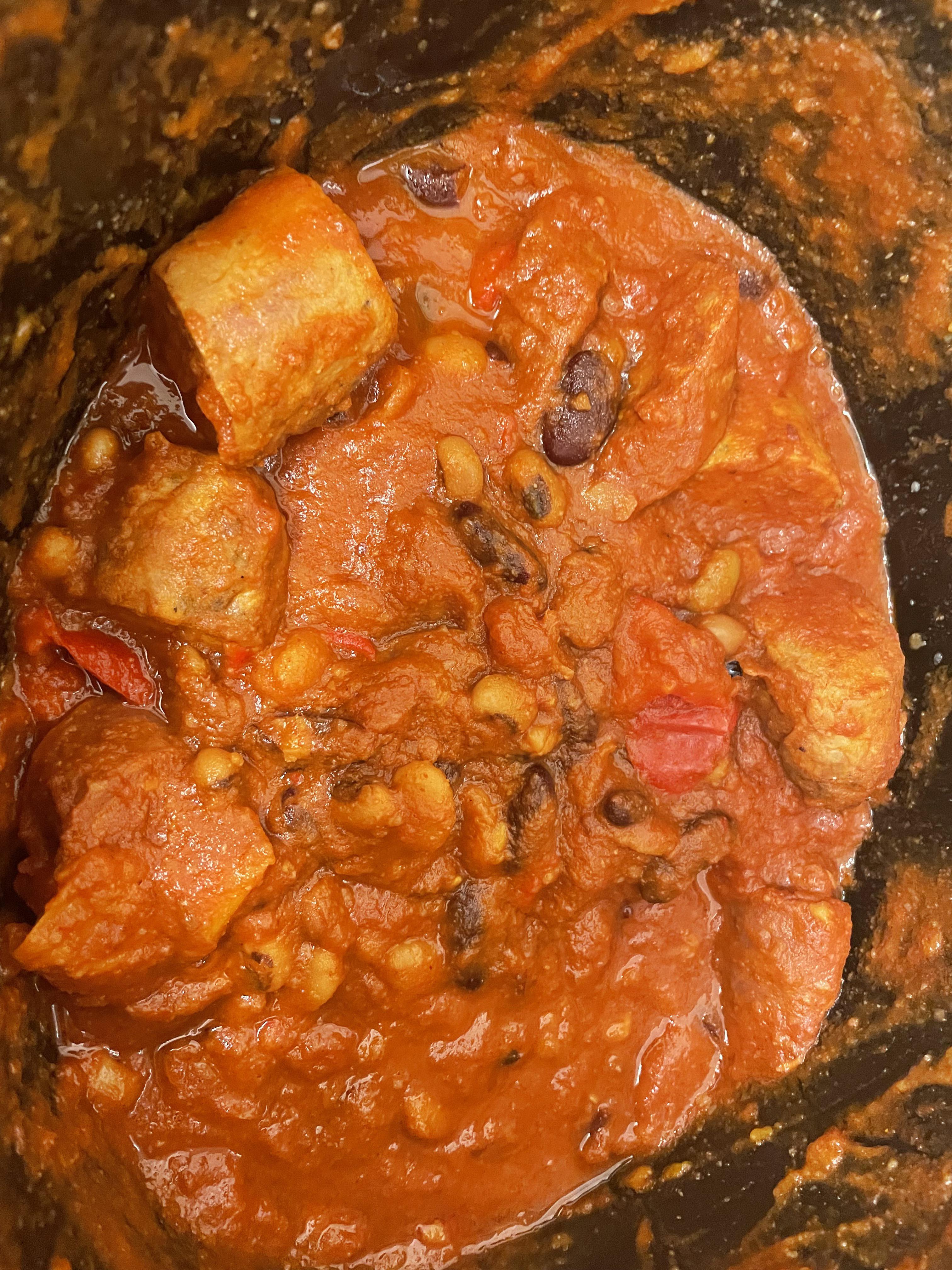 Chop everything into bite size chunks. Add all to the slow cooker. Add 1 and a half tins of water. Season with salt, onion salt, garlic granules, smoked paprika, and pepper to your own taste. Cook on high for 2 hours or low for 4 hours. Enjoy!