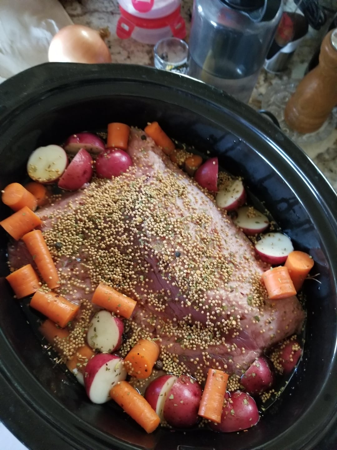 I made this today as well. I didn’t use broth though, just water and about a tablespoon of pickling spice as there was no spice pack with it. I slow cooked it for 8 hrs on low and it was delicious! Not salty at all.