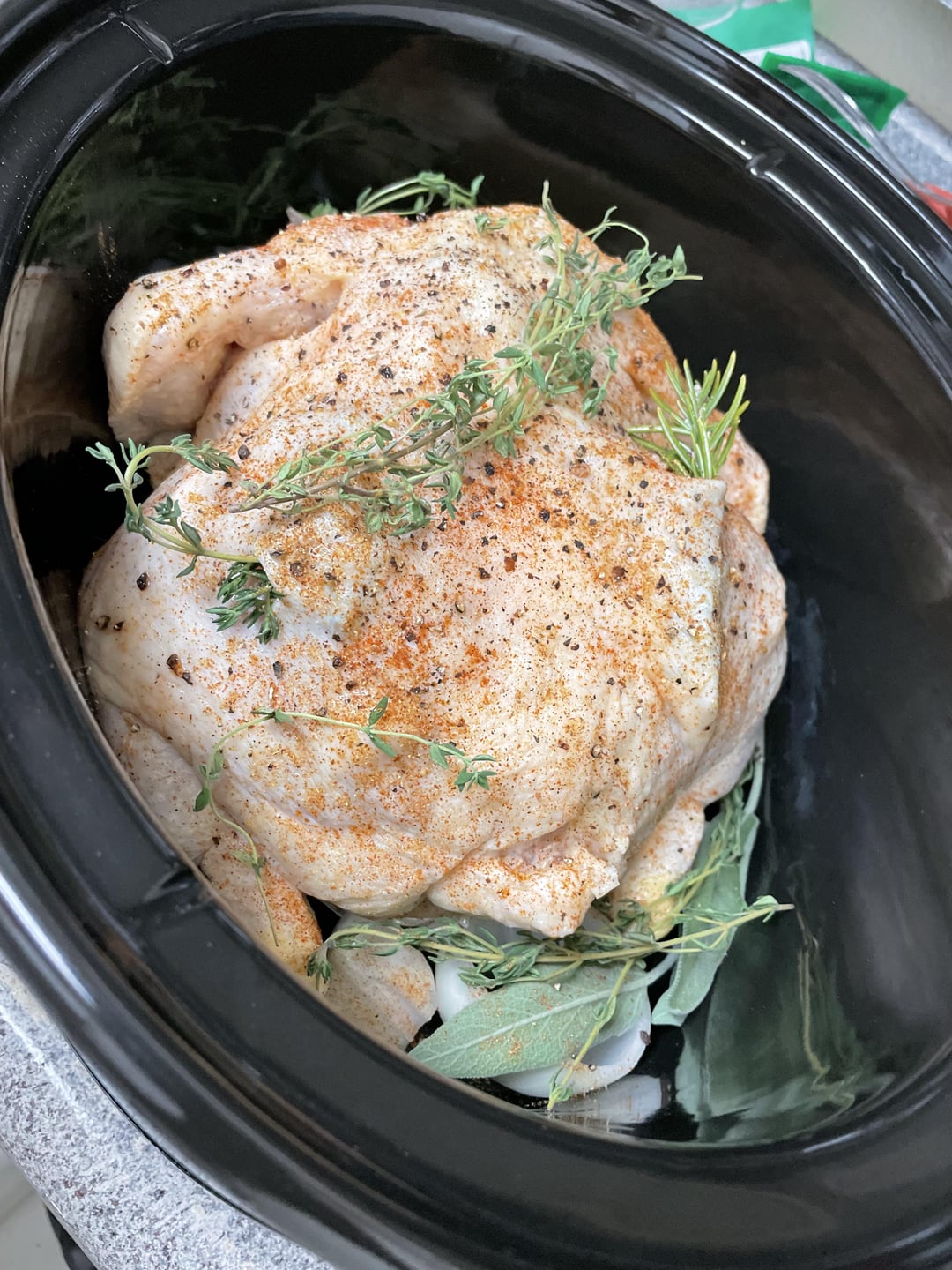 So, cleaned the chicken and added some sliced onion and a bundle of fresh rosemary, sage, and thyme to the cavity. Salt, pepper, and paprika to the outside, rubbed on and under the skin. Also added some smashed garlic cloves under the skin. Made a ring with some foil so it wasn’t resting directly on the bottom of the crockpot and added more herbs. In the crockpot on high for about 3.5-4 hours (kind of lost track of the exact time), then I put it under the broiler for about 5 minutes to crisp up the skin. Leftovers for salads and whatever else for days.