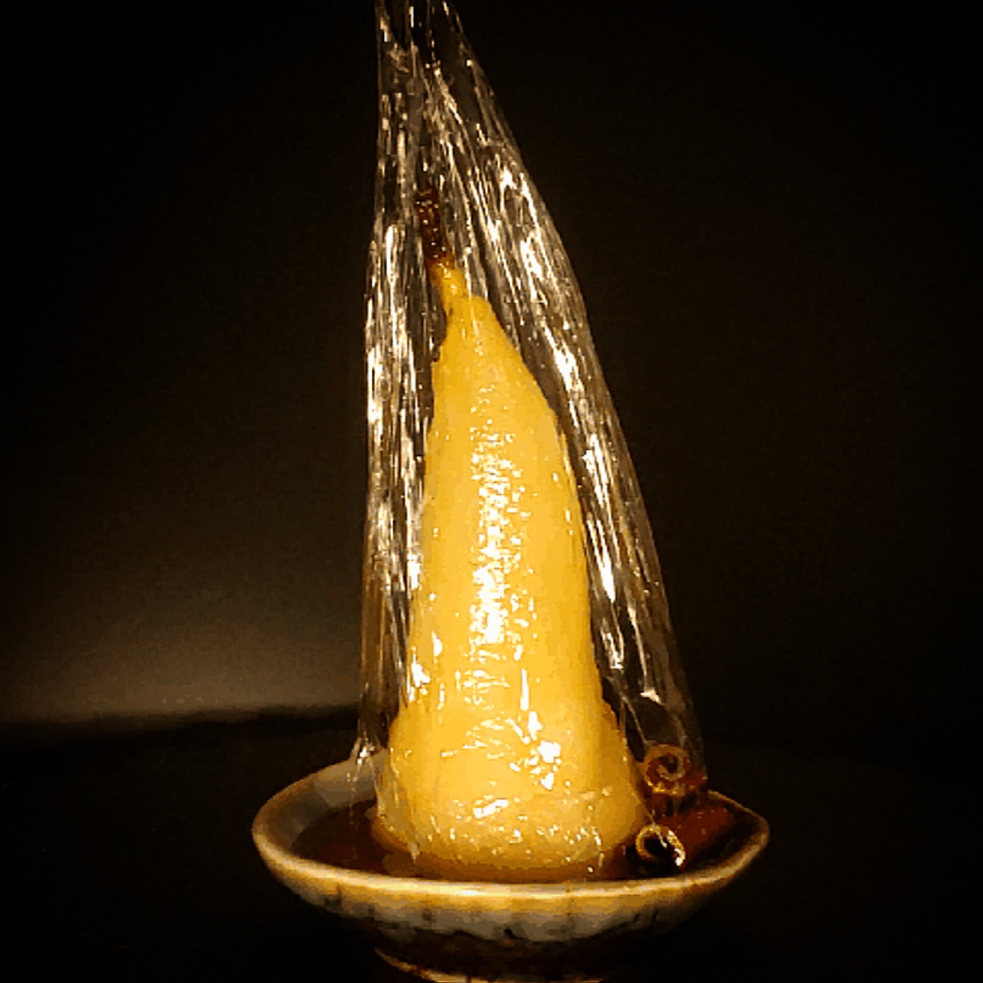 8. Put the pear on a plate, pour the syrup, decorate with a cinnamon stick and isomalt glass