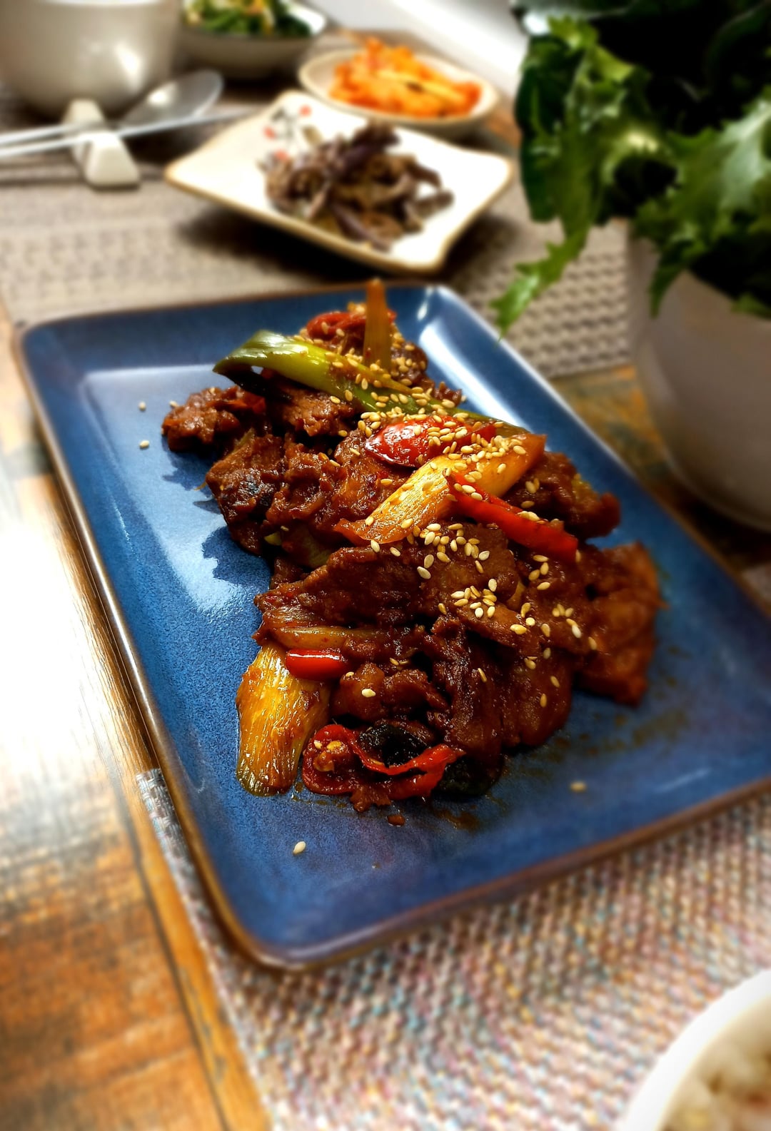krntr23 3 years ago Hi guys! I made a video of myself making this, I’d really appreciate it if you’d drop by and leave a like/comment! 🙂[https://youtu.be/j_D3P41tZYA](https://youtu.be/j_D3P41tZYA)**Jeyuk Bokkeum:**– 400g pork (thinly sliced and cut into bite sized pieces)– half a medium onion, thickly sliced– 1 large stalk of green onion– 1 or 2 tbsp cooking oil**For the marinade:**– 1 tbsp sugar– 3 tbsp gochujang– 1 tbsp gochugaru– 1 tbsp minced garlic– 1 tbsp minced ginger– 2 tbsp soy sauce– 2 tbsp sesame oil– 2 fresh chillies (optional)– a few shakes of black pepper– 3 tbsp Korean plum extract​**Directions:**1. prepare and combine all the ingredients for the marinade2. add sliced pork to marinade and mix well3. let the pork sit in the marinade for at least 30 minutes4. add onions and green onions to marinated pork mix5. heat the oil in a large pan (you may need to cook the pork in 2 batches depending on the size of your pan)6. add the pork and cook in until lightly caramelized. (For best results try not to overcrowd the pan!)7. serve with rice and your favourite banchan!