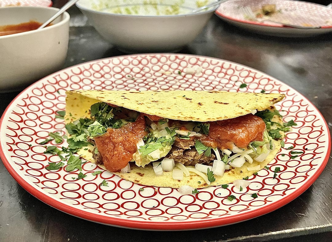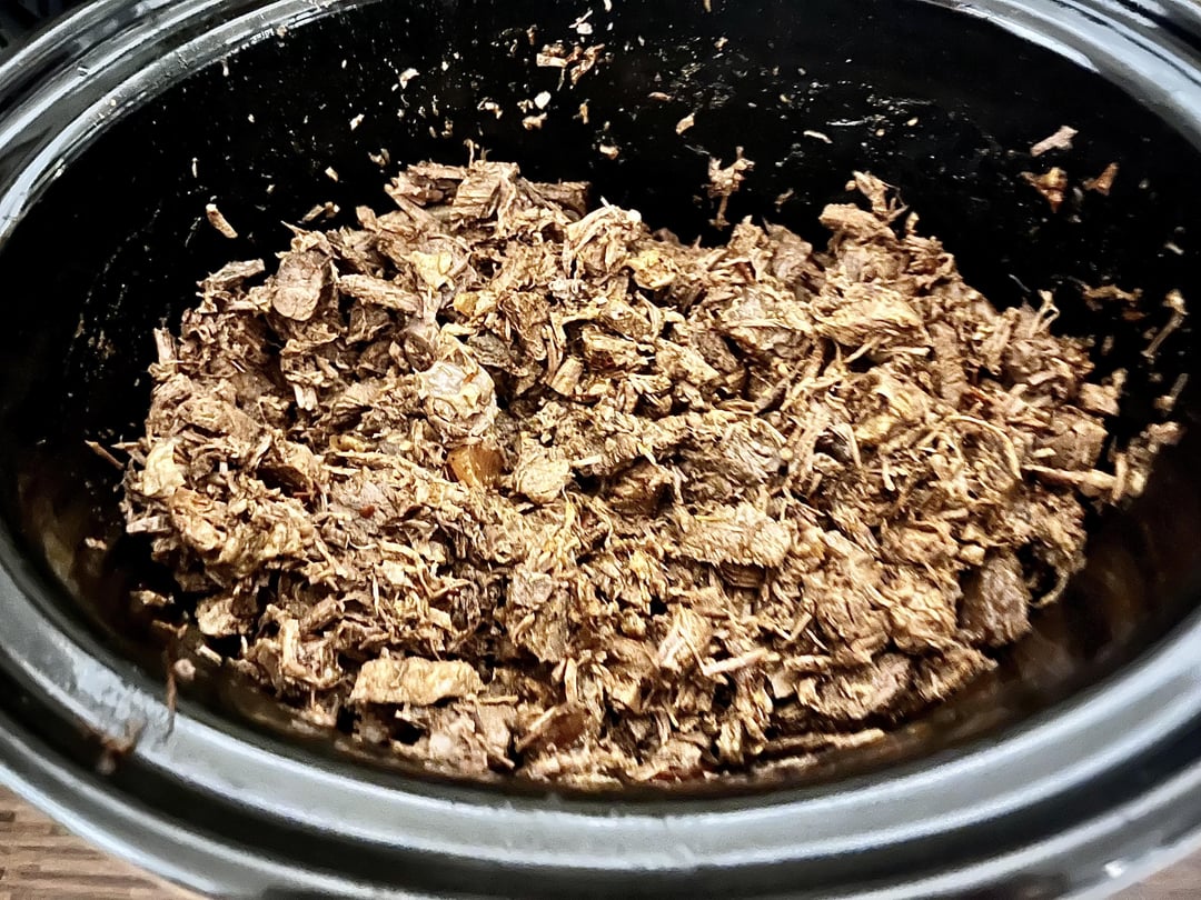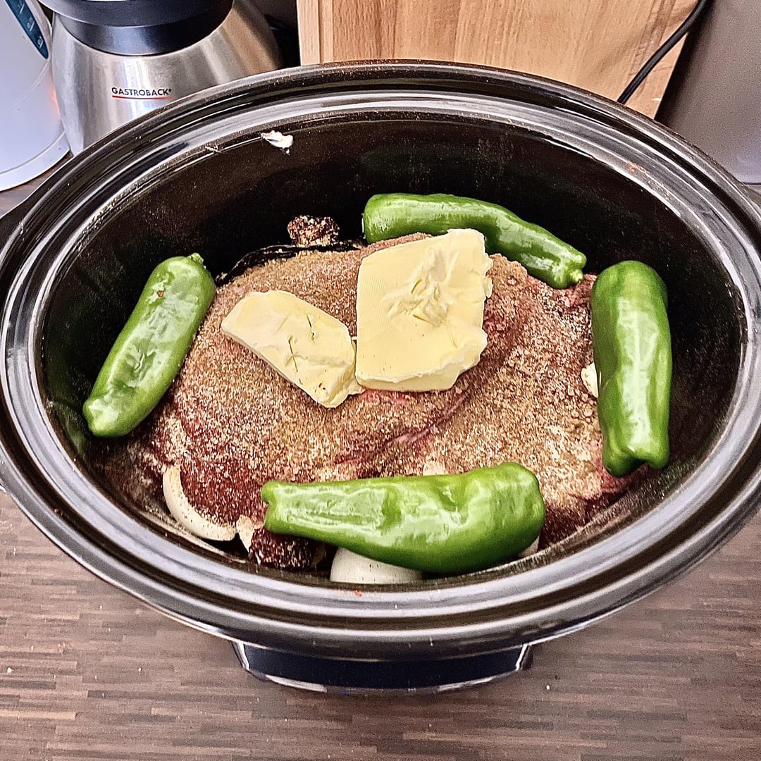 Wash the meat and the green peppers, peel two onions, cut into eighths and put everything together in the slow cooker. Season with salt, pepper, garlic powder, cumin, cinnamon, thyme, paprika, chilli powder, allspice, bay leaf, cloves and marjoram (Quantities were Freestyle). Then add a dried ancho chilli, 2 chipotle chilli, 5 habanero chillies and 125 grams of butter. Fill everything up with about 200-250ml beef broth. Cook on low for 8 hours. At the end of the cooking time, remove the meat and chop it up. Mix the cillis, onions and peppers in the blender and mix partly with the meat.
