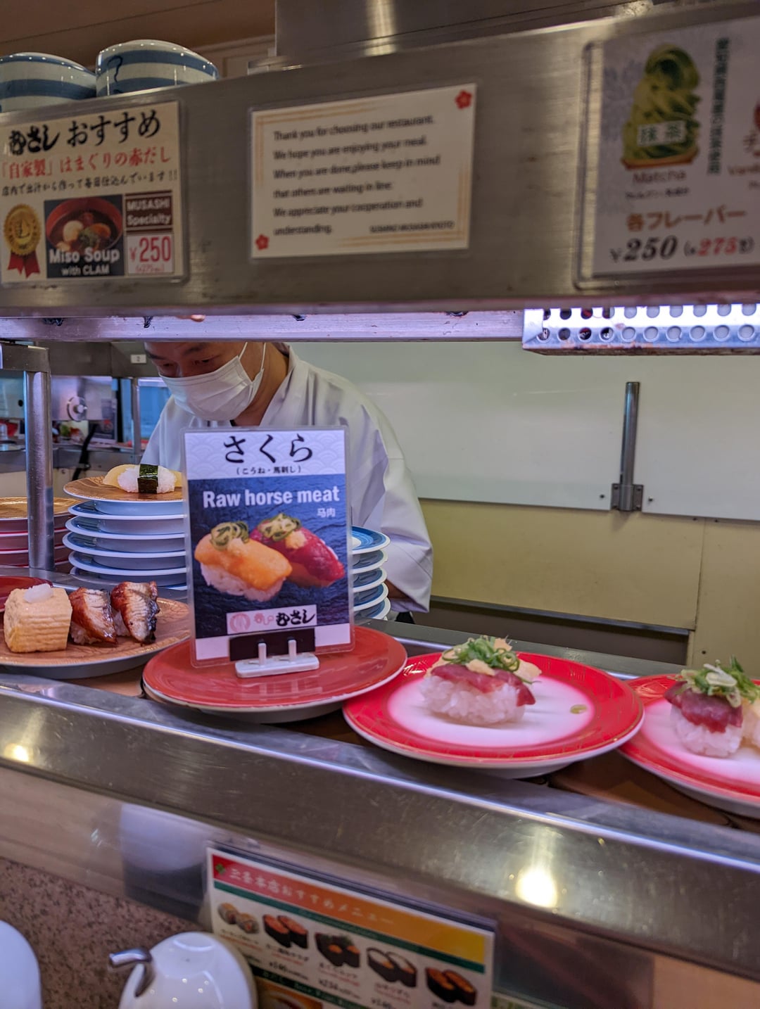 馬刺し Basashi- yeah, I’ve had horse many-a-time and it’s surprisingly good. Fuck that mayo shit though. I am so pumped we are going back to Tokyo/Kyoto in like 3 weeks!!! Gatten Sushi was our favorite kaiten when we lived there. Like OP said, not the best but usually better than what we get in the states and one million times cheaper.
