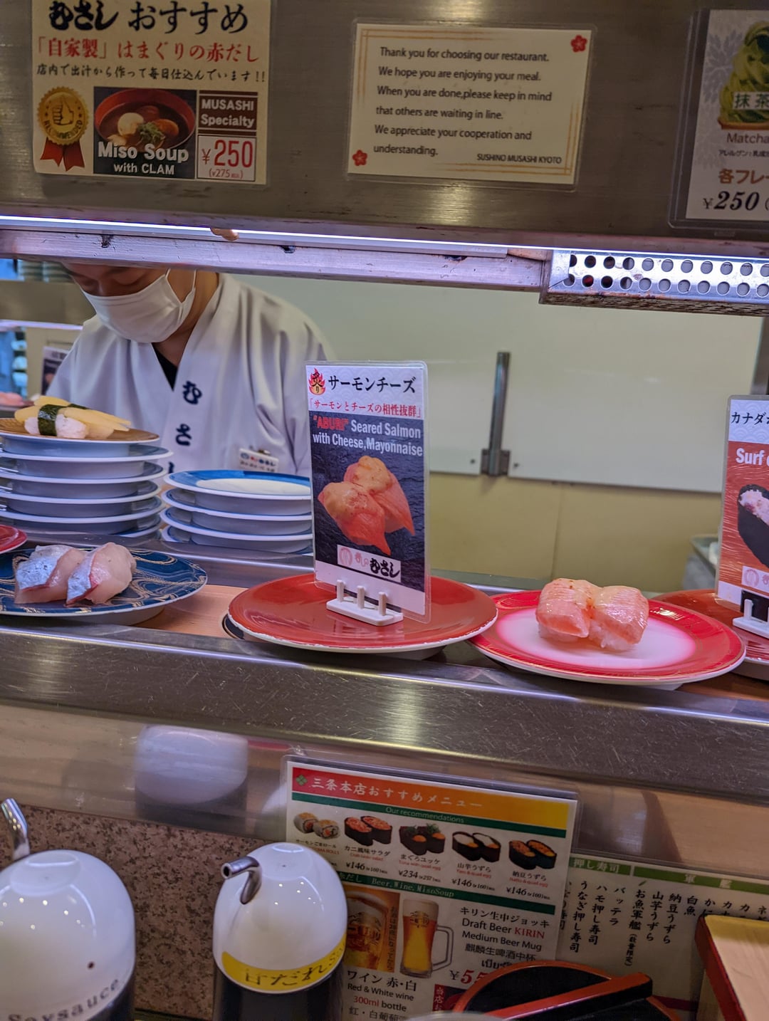 If you’re not familiar with this style of restaurant, you have a conveyer belt of options that go by you and you just grab whatever you like. Cost per item is denoted by the color of the plate it’s on, and staff tally that all up at the end.
