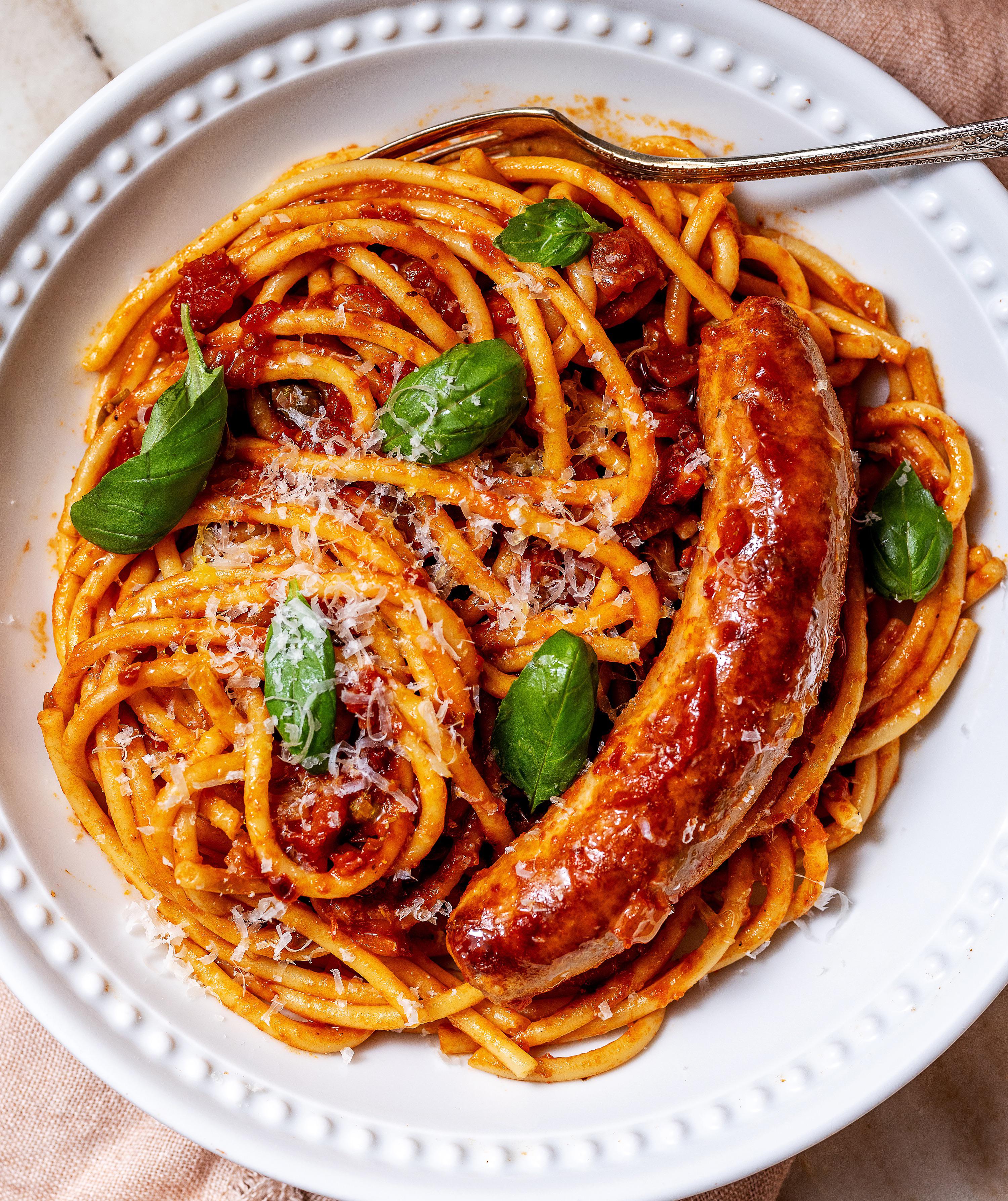 1. Remove the cover from the pot. Check the internal temperature of the sausage to ensure they’ve reached 160ºF. Remove the sausage links from the pot and transfer them to a serving platter. Cover and keep warm. 2. Taste the sauce and adjust the seasonings to your preference. Just note that your pasta water will be quite salty, so keep that in mind as you adjust the seasonings. 3. Add the cooked pasta to the sauce and half the cooking water. Toss to coat until the pasta is glossy. Turn off the heat. 4. Add the grated cheese and continue tossing to coat, adding more pasta water as needed.
