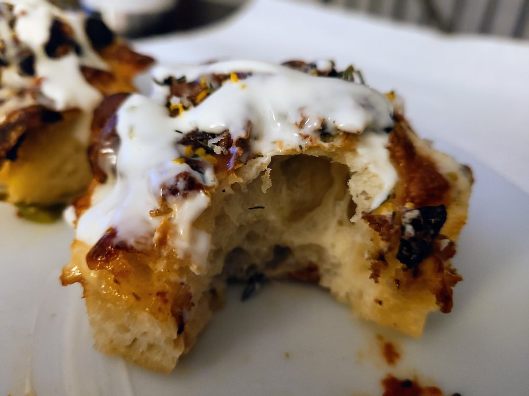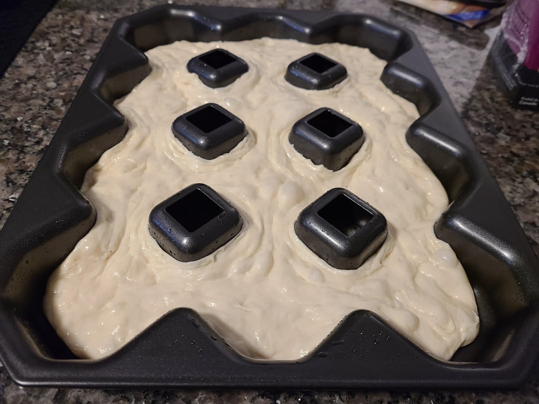 Poolish, 36 hour cold ferm, 78% hydration. I relaxed and spread the dough in a regular pan, then laid it over top the segmented pan and used a sharp knife to cut at each hole and push the dough down around the “post”. Dough ball was 570 and may have been just a titch too much….might go 525 for this pan next time.