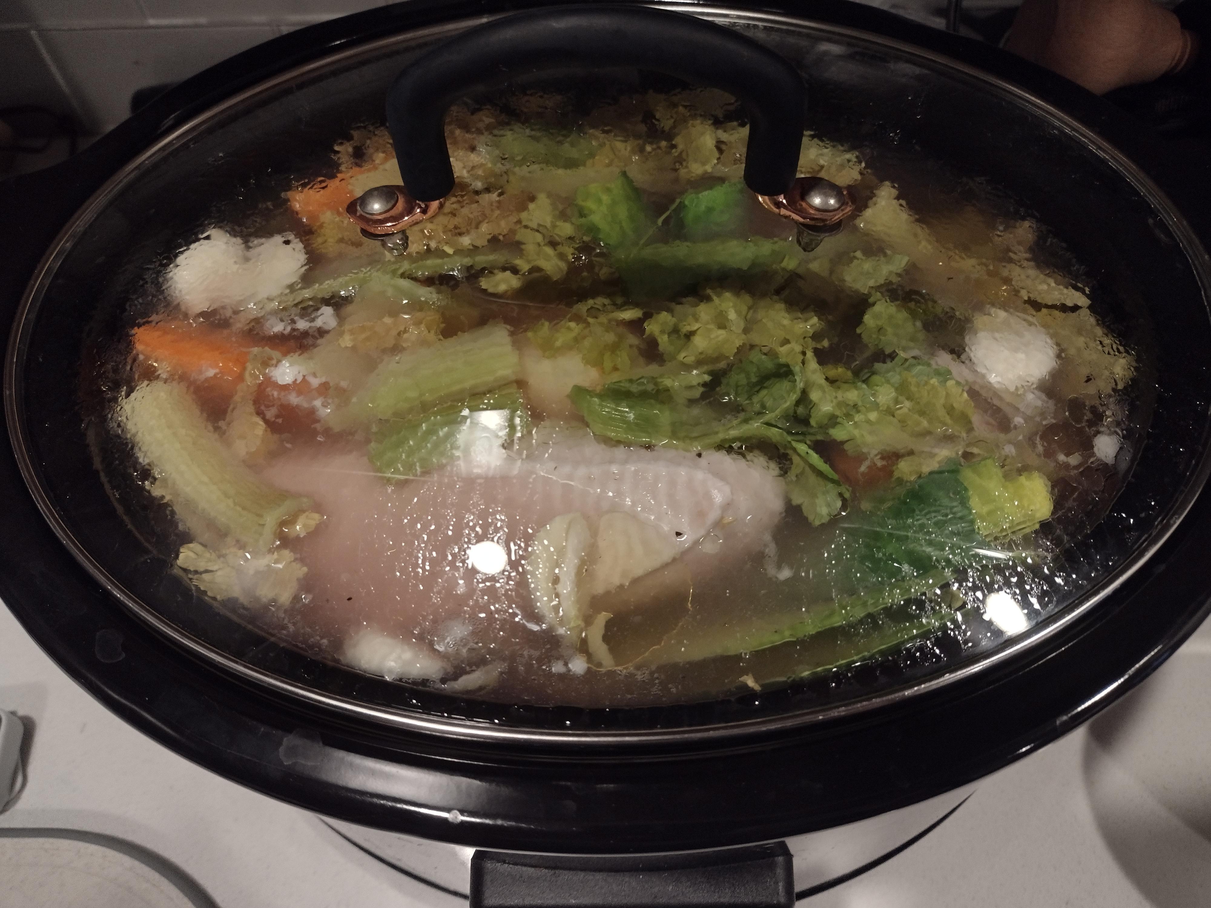 I also wait to add the vegetables. If they’re in for too long, the broth develops bitter off flavours. I add them 4-6 hours before the end.