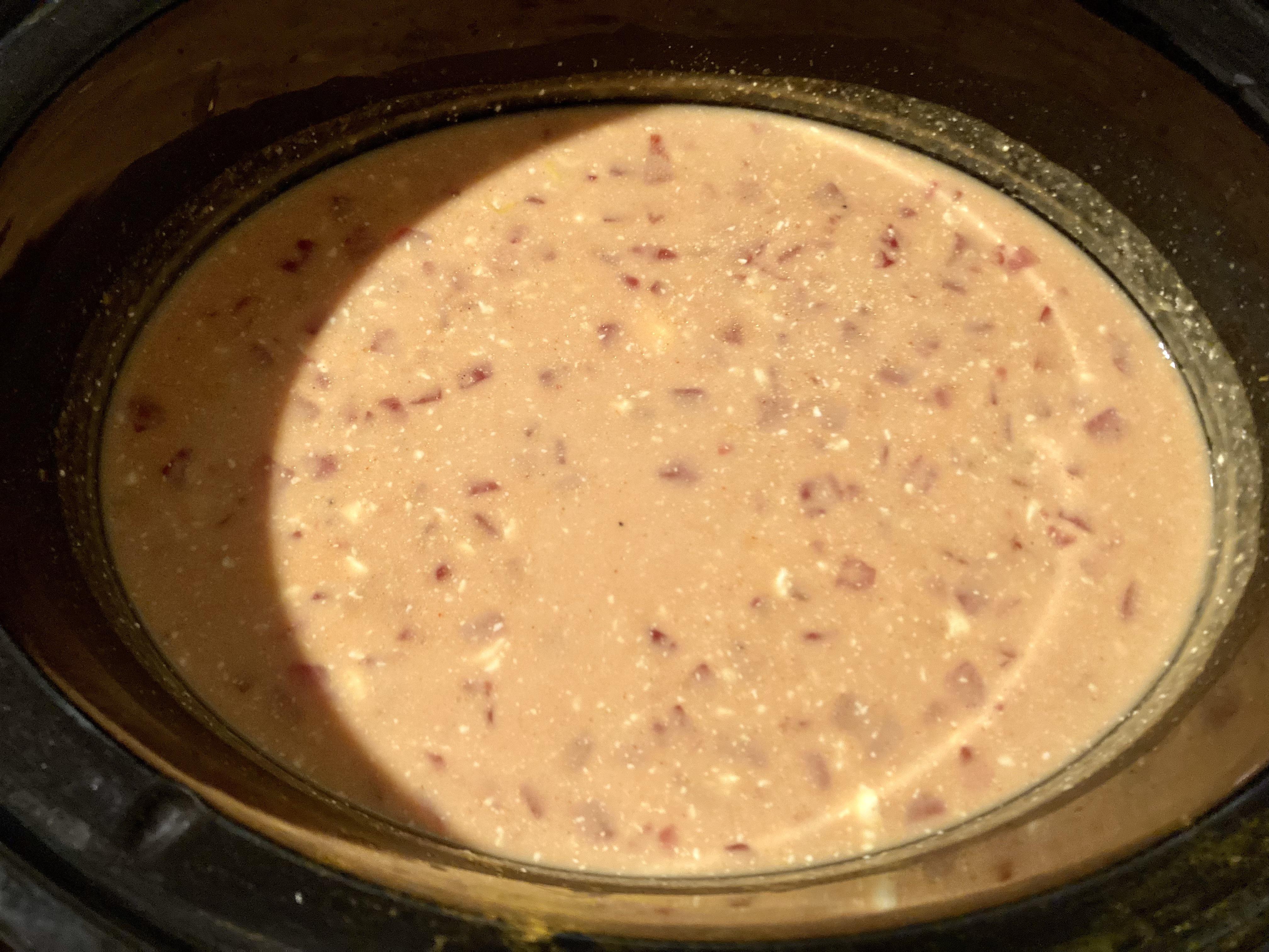 —1 lb ground chicken —3/4 cup Frank’s red hot sauce —3 tablespoons roasted red peppers diced —can diced tomatoes with juices —can great northern beans drained and rinsed —1 8 oz brick cream cheese —4 cups stock of choice —1 teaspoon garlic powder —1 teaspoon onion powder —1 tablespoon salt —1 can corn drained
