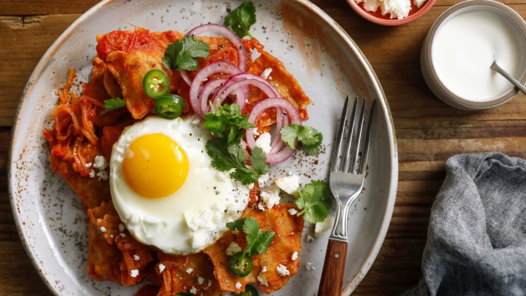 6. Divide chips among plates and top with fried egg, queso fresco, cilantro, crema, remaining green chile, reserved red onions and a squeeze of lime if you like.