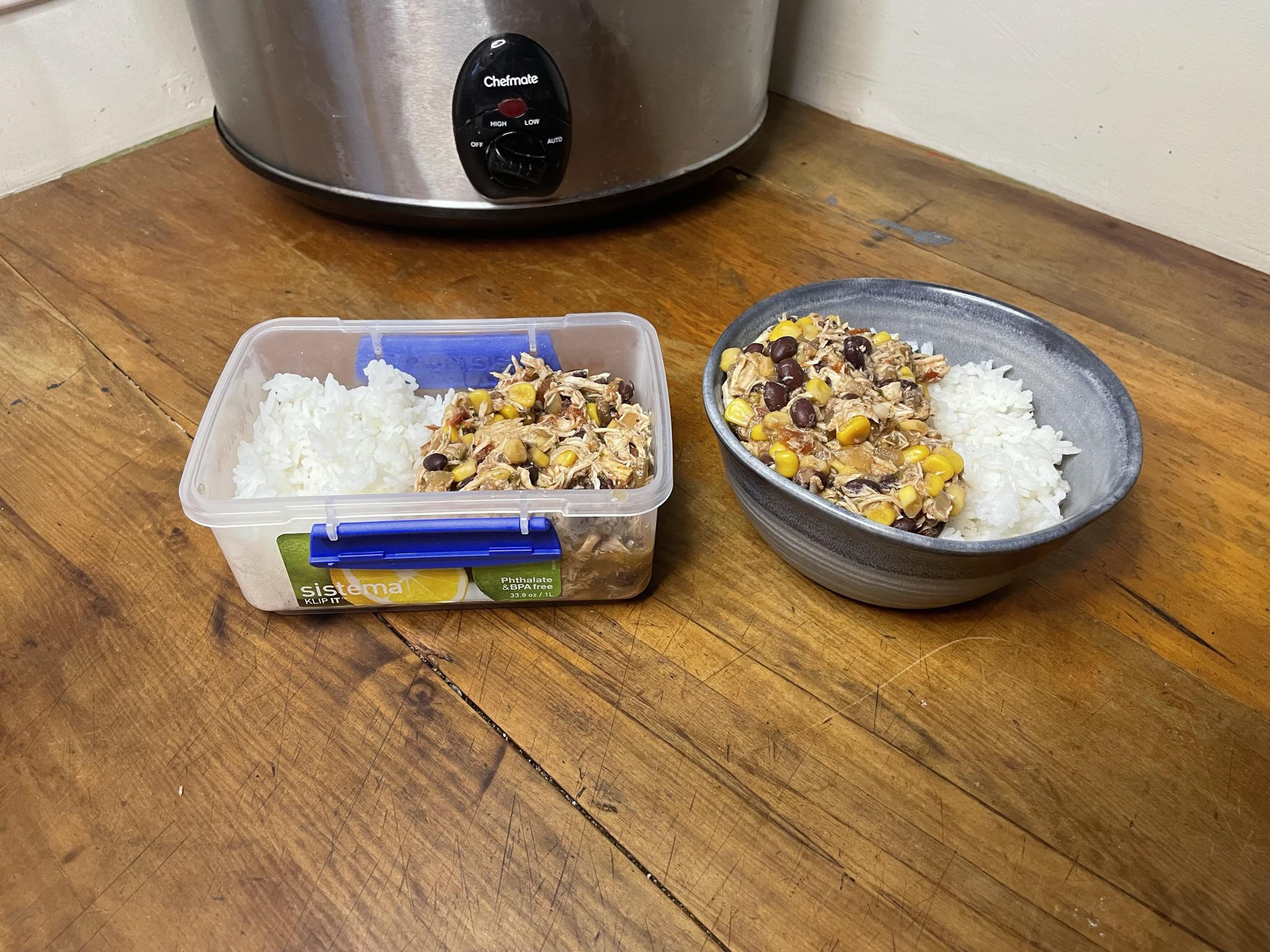 This week I made a Chicken Burrito Bowl with my Slow Cooker. Homemade Salsa and Seasoning, with 700 grams of Chicken for a 5 hour slow cook. Tastes awesome and a bonus of 50 grams of protein per serve!