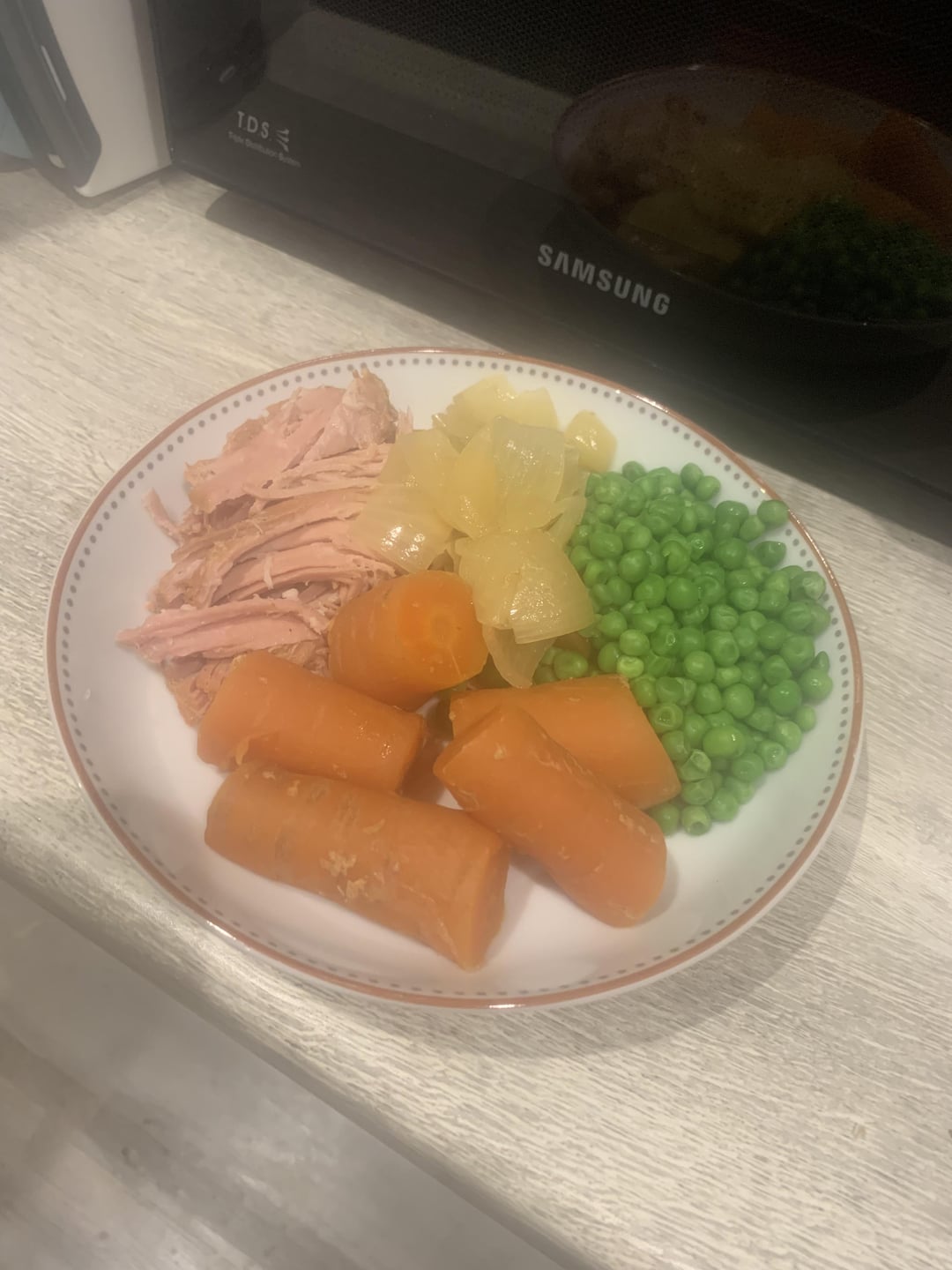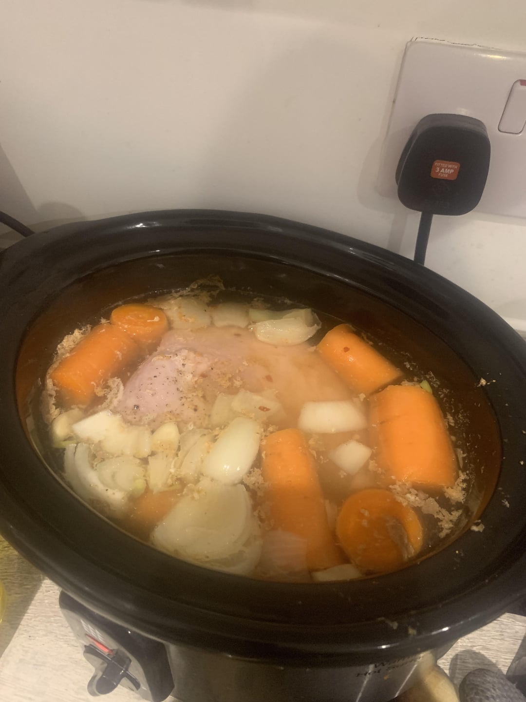 A ham, several carrots, an onion, some water, and a bottle of alcohol free cider, with salt and pepper, and I put it on high for 8 hours, I think?